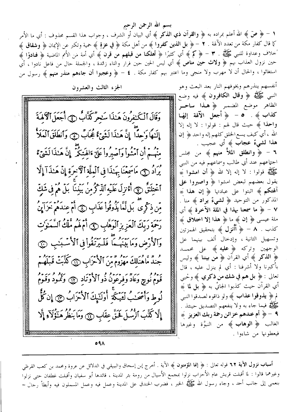 {ص} اللَّه أَعْلَم بِمُرَادِهِ بِهِ {وَالْقُرْآن ذِي الذِّكْر} أَيْ الْبَيَان أَوْ الشَّرَف وَجَوَاب هَذَا الْقَسَم مَحْذُوف أَيْ مَا الْأَمْر كَمَا قَالَ كُفَّار مَكَّة مِنْ تَعَدُّد الْآلِهَة