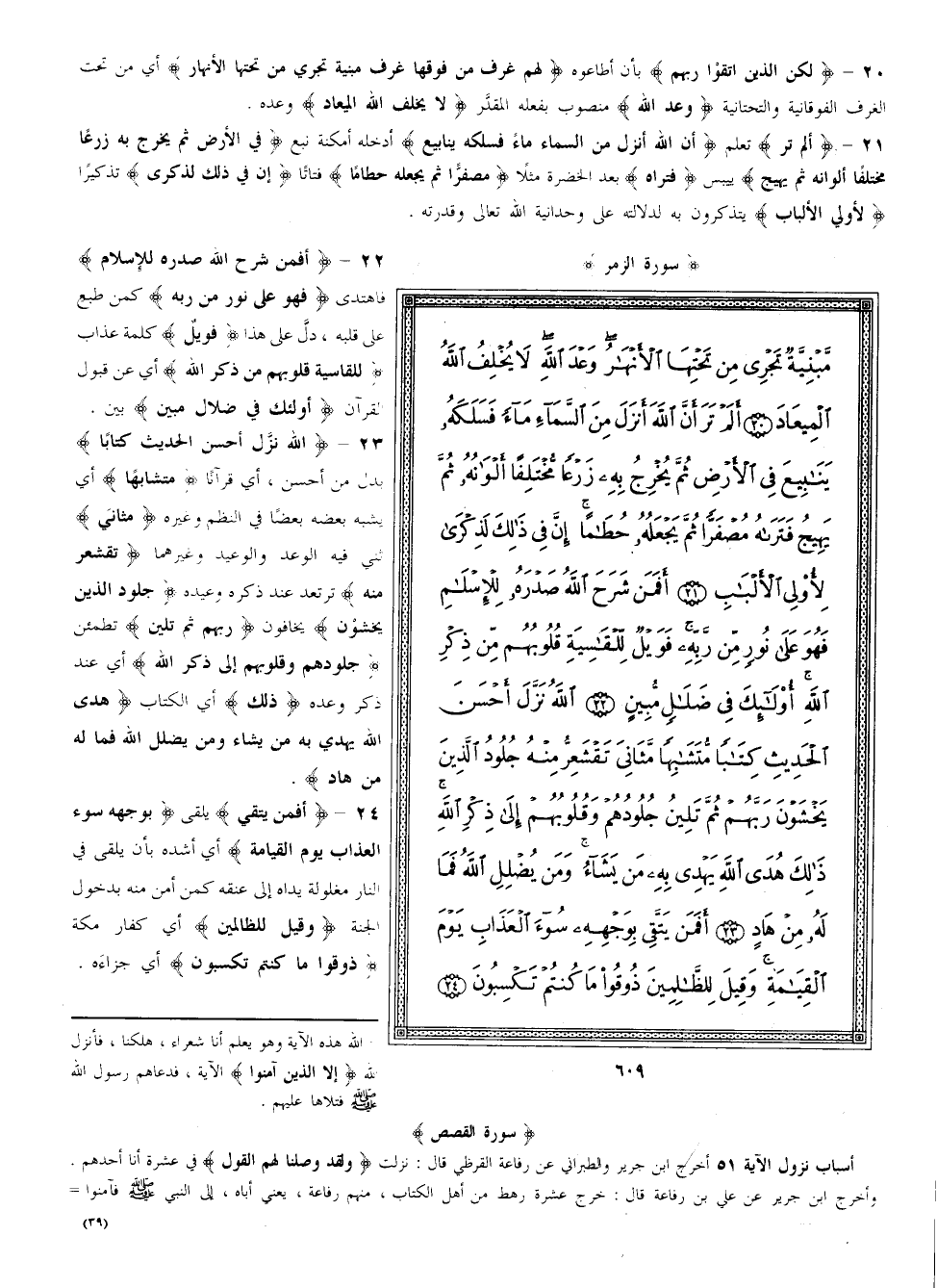 {اللَّه نَزَّلَ أَحْسَنَ الْحَدِيث كِتَابًا} بَدَل مِنْ أَحْسَن أَيْ قُرْآنًا {مُتَشَابِهًا} أَيْ يُشْبِه بَعْضه بَعْضًا فِي النَّظْم وَغَيْره {مَثَانِيَ} ثُنِيَ فِيهِ الْوَعْد وَالْوَعِيد وَغَيْرهمَا {تَقْشَعِرّ مِنْهُ} تَرْتَعِد عِنْد ذكره وَعِيده {جُلُود الَّذِينَ يَخْشَوْنَ} يَخَافُونَ {رَبّهمْ ثُمَّ تَلِينَ} تَطْمَئِنّ {جُلُودهمْ وَقُلُوبهمْ إلَى ذِكْر اللَّه} أَيْ عِنْد ذِكْر وَعْده {ذَلِكَ} أَيْ الْكِتَاب {هدى الله يهدي به من يشاء ومن يضلل الله فما له من هاد