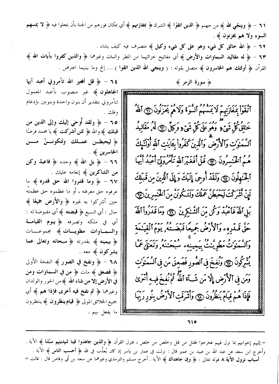 {وَيُنَجِّي اللَّه} مِنْ جَهَنَّم {الَّذِينَ اتَّقَوْا} الشِّرْك {بِمَفَازَتِهِمْ} أَيْ بِمَكَانِ فَوْزهمْ مِنْ الْجَنَّة بِأَنْ يجعلوا فيه {لا يمسهم السوء ولا هم يحزنون}