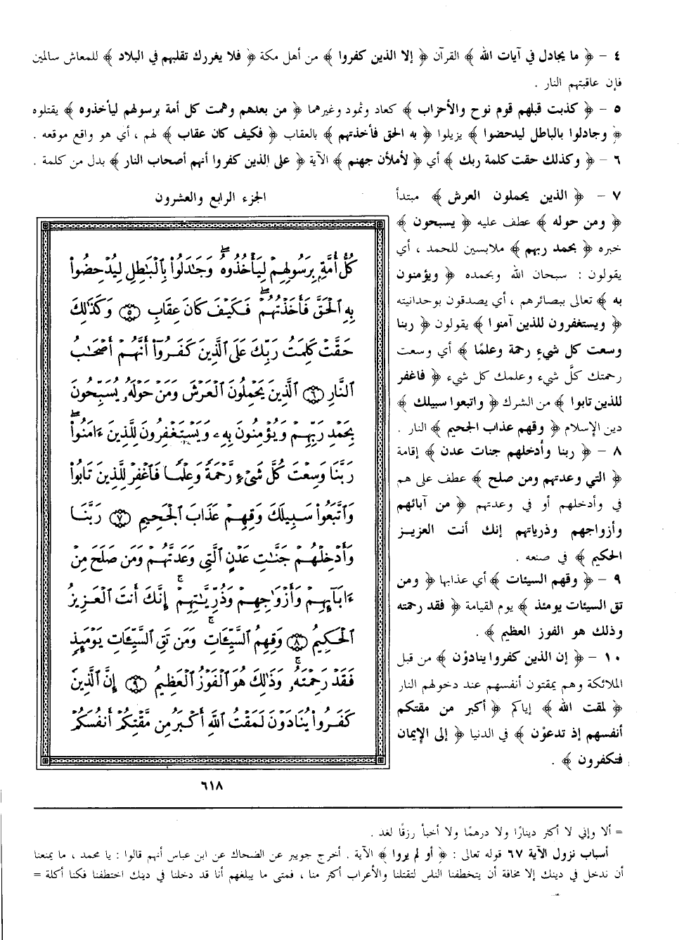 {الَّذِينَ يَحْمِلُونَ الْعَرْش} مُبْتَدَأ {وَمَنْ حَوْله} عُطِفَ عَلَيْهِ {يُسَبِّحُونَ} خَبَره {بِحَمْدِ رَبّهمْ} مُلَابِسِينَ لِلْحَمْدِ أَيْ يَقُولُونَ سُبْحَان اللَّه وَبِحَمْدِهِ {وَيُؤْمِنُونَ بِهِ} تَعَالَى بِبَصَائِرِهِمْ أَيْ يُصَدِّقُونَ بِوَحْدَانِيِّتِهِ {وَيَسْتَغْفِرُونَ لِلَّذِينَ آمَنُوا} يَقُولُونَ {رَبّنَا وَسِعْت كُلّ شَيْء رَحْمَة وَعِلْمًا} أَيْ وَسِعَتْ رَحْمَتك كُلّ شَيْء وَعِلْمك كُلّ شَيْء {فَاغْفِرْ لِلَّذِينَ تَابُوا} مِنْ الشِّرْك {وَاتَّبَعُوا سَبِيلك} دِين الْإِسْلَام {وَقِهمْ عَذَاب الْجَحِيم} النار