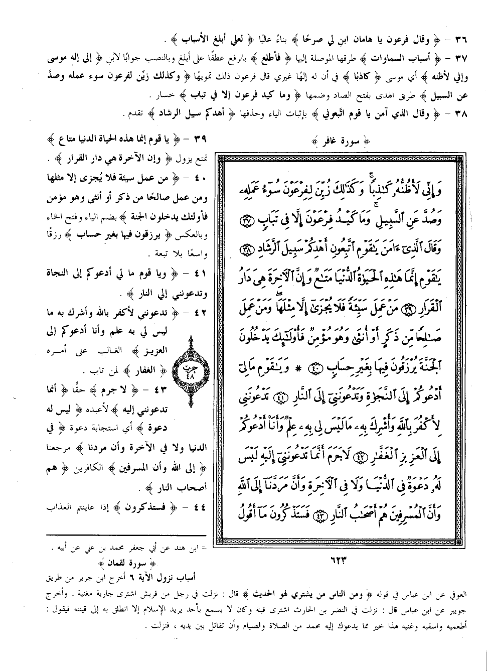 {أَسْبَاب السَّمَاوَات} طُرُقهَا الْمُوَصِّلَة إلَيْهَا {فَأَطَّلِع} بِالرَّفْعِ عَطْفًا عَلَى أَبْلُغ وَبِالنَّصْبِ جَوَابًا لِابْنِ {إلَى إلَه مُوسَى وَإِنِّي لَأَظُنّهُ} أَيْ مُوسَى {كَاذِبًا} فِي أَنَّ لَهُ إلَهًا غَيْرِي قَالَ فِرْعَوْن ذَلِكَ تَمْوِيهًا {وَكَذَلِك زُيِّنَ لِفِرْعَوْن سُوء عَمَله وَصُدَّ عَنِ السَّبِيل} طَرِيق الْهُدَى بِفَتْحِ الصَّاد وَضَمّهَا {وَمَا كَيْد فِرْعَوْن إلَّا فِي تَبَاب} خسار