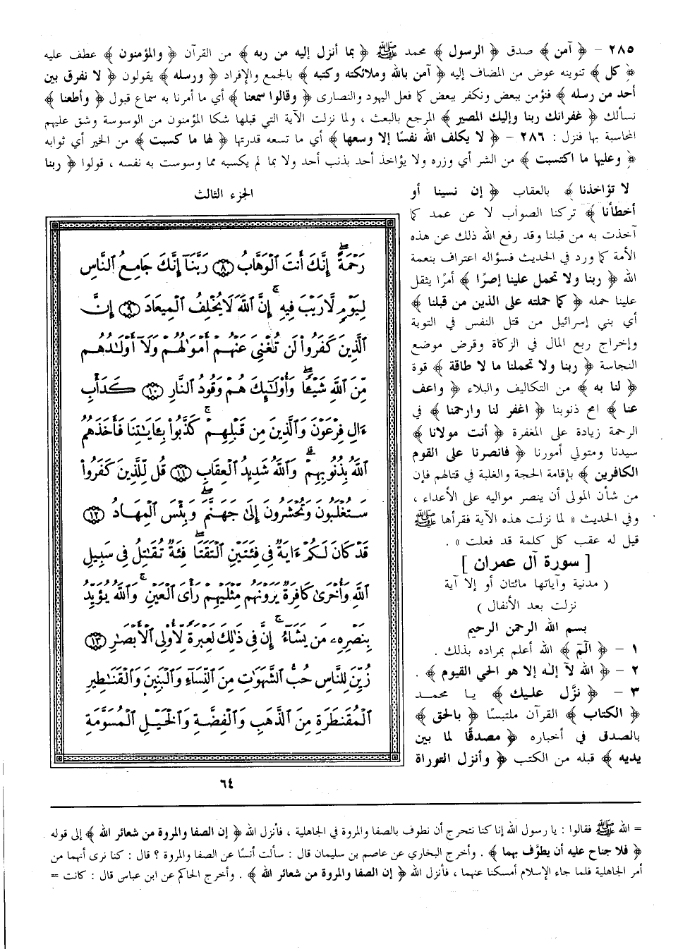{لَا يُكَلِّف اللَّه نَفْسًا إلَّا وُسْعهَا} أَيْ ما تسعه قدرتها {لها ما كَسَبَتْ} مِنْ الْخَيْر أَيْ ثَوَابه {وَعَلَيْهَا مَا اكْتَسَبَتْ} مِنْ الشَّرّ أَيْ وِزْره وَلَا يُؤَاخَذ أَحَد بِذَنْبِ أَحَد وَلَا بِمَا لَمْ يَكْسِبهُ مِمَّا وَسْوَسَتْ بِهِ نَفْسه قُولُوا {رَبّنَا لَا تُؤَاخِذنَا} بِالْعِقَابِ {إنْ نَسِينَا أَوْ أَخْطَأْنَا} تَرَكْنَا الصَّوَاب لَا عَنْ عَمْد كَمَا آخَذْت بِهِ مَنْ قَبْلنَا وَقَدْ رَفَعَ اللَّه ذَلِكَ عَنْ هَذِهِ الْأُمَّة كَمَا وَرَدَ فِي الْحَدِيث فَسُؤَاله اعْتِرَاف بِنِعْمَةِ اللَّه {رَبّنَا وَلَا تَحْمِل عَلَيْنَا إصْرًا} أَمْرًا يَثْقُل عَلَيْنَا حَمْله {كَمَا حَمَلْته عَلَى الَّذِينَ مِنْ قَبْلنَا} أَيْ بَنِي إسْرَائِيل مِنْ قَتْل النَّفْس فِي التَّوْبَة وَإِخْرَاج رُبُع الْمَال فِي الزَّكَاة وَقَرْض مَوْضِع النَّجَاسَة {رَبّنَا وَلَا تُحَمِّلنَا مَا لَا طَاقَة} قُوَّة {لَنَا بِهِ} مِنْ التَّكَالِيف وَالْبَلَاء {وَاعْفُ عَنَّا} اُمْحُ ذُنُوبنَا {وَاغْفِرْ لَنَا وَارْحَمْنَا} فِي الرَّحْمَة زِيَادَة عَلَى الْمَغْفِرَة {أَنْت مَوْلَانَا} سَيِّدنَا وَمُتَوَلِّي أُمُورنَا {فَانْصُرْنَا عَلَى الْقَوْم الْكَافِرِينَ} بِإِقَامَةِ الْحُجَّة وَالْغَلَبَة فِي قِتَالهمْ فَإِنَّ مِنْ شَأْن الْمَوْلَى أَنْ يَنْصُر مَوَالِيه عَلَى الْأَعْدَاء وَفِي الْحَدِيث لَمَّا نَزَلَتْ هَذِهِ الْآيَة فَقَرَأَهَا صَلَّى اللَّه عَلَيْهِ وَسَلَّمَ قِيلَ لَهُ عَقِب كُلّ كَلِمَة قَدْ فَعَلْت = 3 سُورَة آل عِمْرَان