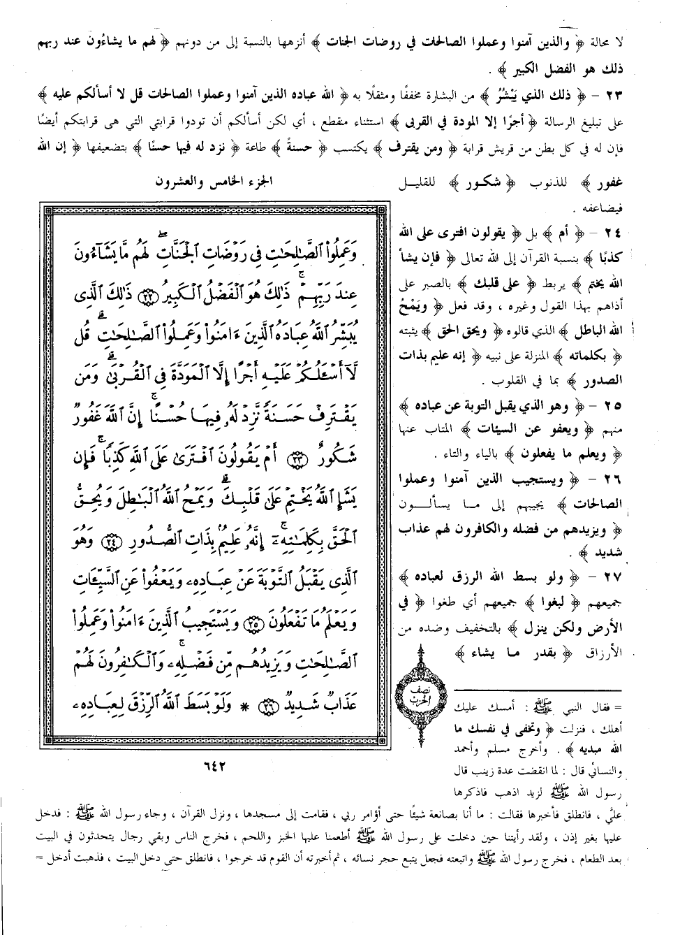 {ذَلِكَ الَّذِي يُبَشِّر} مِنْ الْبِشَارَة مُخَفَّفًا وَمُثَقَّلًا بِهِ {اللَّه عِبَاده الَّذِينَ آمَنُوا وَعَمِلُوا الصَّالِحَات قُلْ لَا أَسْأَلكُمْ عَلَيْهِ} عَلَى تَبْلِيغ الرِّسَالَة {أَجْرًا إلَّا الْمَوَدَّة فِي الْقُرْبَى} اسْتِثْنَاء مُنْقَطِع أَيْ لَكِنْ أَسْأَلكُمْ أَنْ تَوَدُّوا قَرَابَتِي الَّتِي هِيَ قَرَابَتكُمْ أَيْضًا فَإِنَّ لَهُ فِي كُلّ بَطْن مِنْ قُرَيْش قَرَابَة {وَمَنْ يَقْتَرِف} يَكْتَسِب {حَسَنَة} طَاعَة {نَزِدْ لَهُ فِيهَا حُسْنًا} بِتَضْعِيفِهَا {إنَّ اللَّه غَفُور}