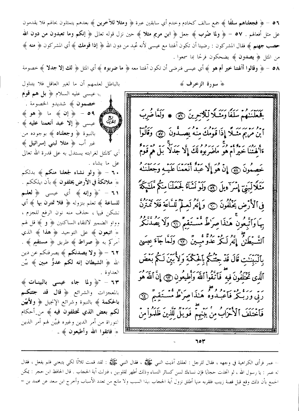 {ولما ضرب} جعل {بن مَرْيَم مَثَلًا} حِين نَزَلَ قَوْله تَعَالَى {إنَّكُمْ وَمَا تَعْبُدُونَ مِنْ دُون اللَّه حَصَب جَهَنَّم} فَقَالَ الْمُشْرِكُونَ رَضِينَا أَنْ تَكُون آلِهَتنَا مَعَ عِيسَى لِأَنَّهُ عُبِدَ مِنْ دُون اللَّه {إذَا قَوْمك} أَيْ الْمُشْرِكُونَ {مِنْهُ} مِنْ الْمَثَل {يَصِدُّونَ} يَضْحَكُونَ فَرَحًا بِمَا سَمِعُوا