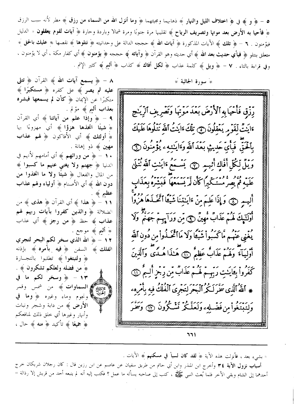 {وَإِذَا عَلِمَ مِنْ آيَاتنَا} أَيْ الْقُرْآن {شَيْئًا اتخذها هزؤا} أَيْ مَهْزُوءًا بِهَا {أُولَئِكَ} أَيْ الْأَفَّاكُونَ {لَهُمْ عَذَاب مُهِين} ذُو إهَانَة