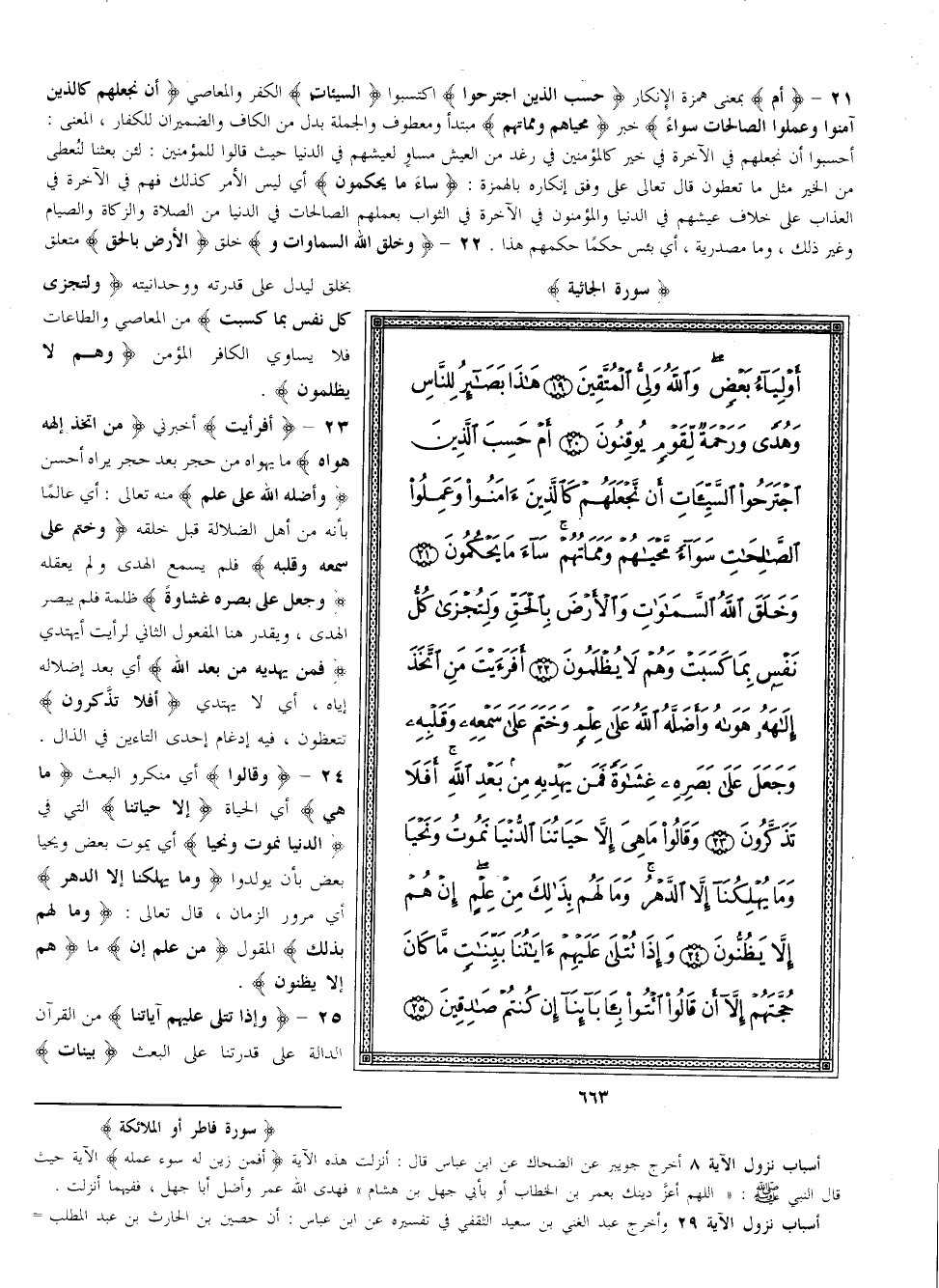 {أَمْ} بِمَعْنَى هَمْزَة الْإِنْكَار {حَسِبَ الَّذِينَ اجْتَرَحُوا} اكْتَسَبُوا {السَّيِّئَات} الْكُفْر وَالْمَعَاصِي {أَنْ نَجْعَلهُمْ كَاَلَّذِينَ آمَنُوا وَعَمِلُوا الصَّالِحَات سَوَاء} خَبَر {مَحْيَاهُمْ وَمَمَاتهمْ} مُبْتَدَأ وَمَعْطُوف وَالْجُمْلَة بَدَل مِنْ الْكَاف وَالضَّمِيرَانِ لِلْكُفَّارِ الْمَعْنَى أَحَسِبُوا أَنْ نَجْعَلهُمْ فِي الْآخِرَة فِي خَيْر كَالْمُؤْمِنِينَ فِي رَغَد مِنْ الْعَيْش مُسَاوٍ لِعَيْشِهِمْ فِي الدُّنْيَا حَيْثُ قَالُوا لِلْمُؤْمِنِينَ لَئِنْ بُعِثْنَا لَنُعْطَى مِنْ الْخَيْر مِثْل مَا تُعْطُونَ قَالَ تَعَالَى عَلَى وَفْق إنْكَاره بِالْهَمْزَةِ {سَاءَ مَا يَحْكُمُونَ} أَيْ لَيْسَ الْأَمْر كَذَلِكَ فَهُمْ فِي الْآخِرَة فِي الْعَذَاب عَلَى خِلَاف عَيْشهمْ فِي الدُّنْيَا وَالْمُؤْمِنُونَ فِي الْآخِرَة فِي الثَّوَاب بِعَمَلِهِمْ الصَّالِحَات فِي الدُّنْيَا مِنْ الصَّلَاة وَالزَّكَاة وَالصِّيَام وَغَيْر ذَلِكَ وَمَا مَصْدَرِيَّة أَيْ بئس حكما حكمهم هذا