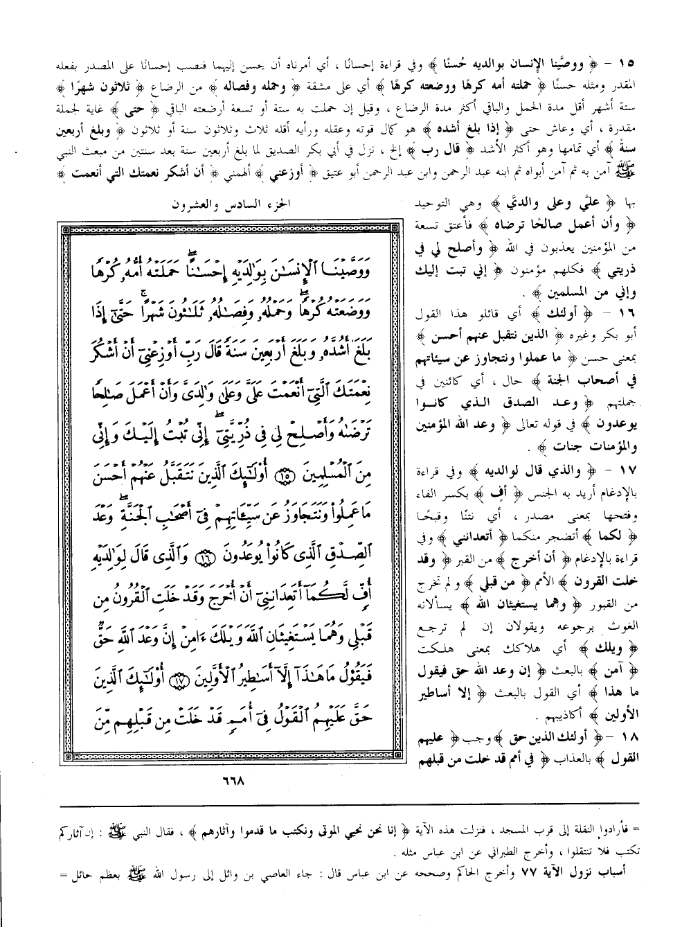 {ووصينا الإنسان بوالديه حسنا} وَفِي قِرَاءَة إحْسَانًا أَيْ أَمَرْنَاهُ أَنْ يُحْسِن إلَيْهِمَا فَنَصَبَ إحْسَانًا عَلَى الْمَصْدَر بِفِعْلِهِ الْمُقَدَّر وَمِثْله حَسَنًا {حَمَلَتْهُ أُمّه كُرْهًا وَوَضَعَتْهُ كُرْهًا} أَيْ عَلَى مَشَقَّة {وَحَمْله وَفِصَاله} مِنْ الرَّضَاع {ثَلَاثُونَ شَهْرًا} سِتَّة أَشْهُر أَقَلّ مُدَّة الْحَمْل وَالْبَاقِي أَكْثَر مُدَّة الرَّضَاع وَقِيلَ إنْ حَمَلَتْ بِهِ سِتَّة أَوْ تِسْعَة أَرْضَعَتْهُ الْبَاقِي {حَتَّى} غَايَة لِجُمْلَةٍ مُقَدَّرَة أَيْ وَعَاشَ حَتَّى {إذَا بَلَغَ أَشُدّهُ} هُوَ كَمَال قُوَّته وَعَقْله وَرَأْيه أَقَلّه ثَلَاث وَثَلَاثُونَ سَنَة أَوْ ثَلَاثُونَ {وَبَلَغَ أَرْبَعِينَ سَنَة} أَيْ تَمَامهَا وَهُوَ أَكْثَر الْأَشُدّ {قَالَ رَبّ} إلَخْ نَزَلَ فِي أَبِي بَكْر الصِّدِّيق لَمَّا بَلَغَ أَرْبَعِينَ سَنَة بَعْد سَنَتَيْنِ مِنْ مَبْعَث النَّبِيّ صَلَّى اللَّه عَلَيْهِ وَسَلَّمَ آمَنَ بِهِ ثُمَّ آمَنَ أَبَوَاهُ ثُمَّ ابْنه عبد الرحمن وبن عَبْد الرَّحْمَن أَبُو عَتِيق {أَوْزِعْنِي} أَلْهِمْنِي {أَنْ أَشْكُر نِعْمَتك الَّتِي أَنْعَمْت} بِهَا {عَلَيَّ وَعَلَى وَالِدِيَّ} وَهِيَ التَّوْحِيد {وَأَنْ أَعْمَل صَالِحًا تَرْضَاهُ} فَأَعْتَقَ تِسْعَة مِنْ الْمُؤْمِنِينَ يُعَذَّبُونَ فِي اللَّه وأصلح لي في ذريتي فكلهم مؤمنون {إني تبت إليك وإني من المسلمين}