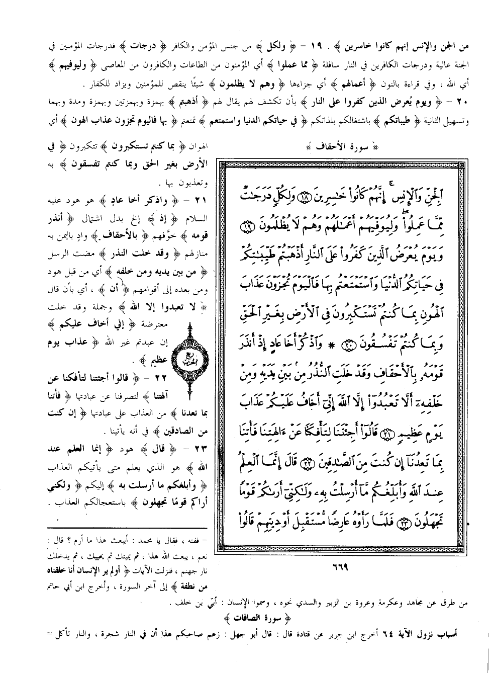 {وَاذْكُرْ أَخَا عَادٍ} هُوَ هُود عَلَيْهِ السَّلَام {إذْ} إلَخْ بَدَل اشْتِمَال {أَنْذَرَ قَوْمه} خَوَّفَهُمْ {بِالْأَحْقَافِ} وَادٍ بِالْيَمَنِ بِهِ مَنَازِلهمْ {وَقَدْ خَلَتْ النُّذُر} مَضَتْ الرُّسُل {مِنْ بَيْن يَدَيْهِ وَمِنْ خَلْفه} أَيْ مِنْ قَبْل هُود وَمِنْ بَعْده إلَى أَقْوَامهمْ {أَنْ} أَيْ بِأَنْ قَالَ {لَا تَعْبُدُوا إلَّا اللَّه} وَجُمْلَة وَقَدْ خَلَتْ مُعْتَرِضَة {إنِّي أَخَاف عَلَيْكُمْ} إنْ عَبَدْتُمْ غَيْر اللَّه {عذاب يوم عظيم}