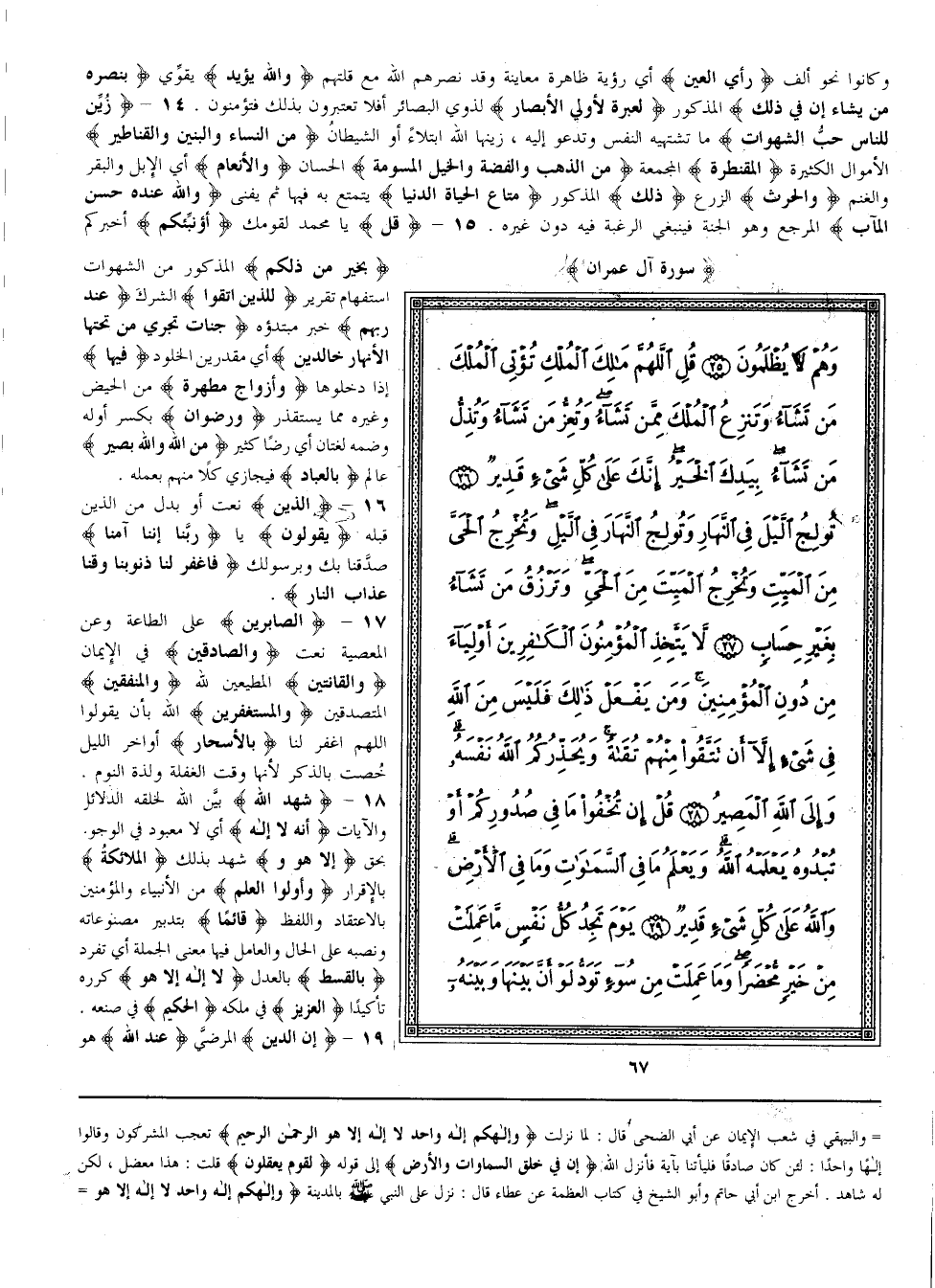 {زُيِّنَ لِلنَّاسِ حُبّ الشَّهَوَات} مَا تَشْتَهِيه النَّفْس وَتَدْعُو إلَيْهِ زَيَّنَهَا اللَّه ابْتِلَاء أَوْ الشَّيْطَان {مِنْ النِّسَاء وَالْبَنِينَ وَالْقَنَاطِير} الْأَمْوَال الْكَثِيرَة {الْمُقَنْطَرَة} الْمُجْمَعَة {مِنْ الذَّهَب وَالْفِضَّة وَالْخَيْل الْمُسَوَّمَة} الْحِسَان {وَالْأَنْعَام} أَيْ الْإِبِل وَالْبَقَر وَالْغَنَم {وَالْحَرْث} الزَّرْع {ذَلِكَ} الْمَذْكُور {مَتَاع الْحَيَاة الدُّنْيَا} يَتَمَتَّع بِهِ فِيهَا ثُمَّ يَفْنَى {وَاَللَّه عِنْده حُسْن الْمَآب} الْمَرْجِع وَهُوَ الْجَنَّة فَيَنْبَغِي الرَّغْبَة فِيهِ دُون غيره