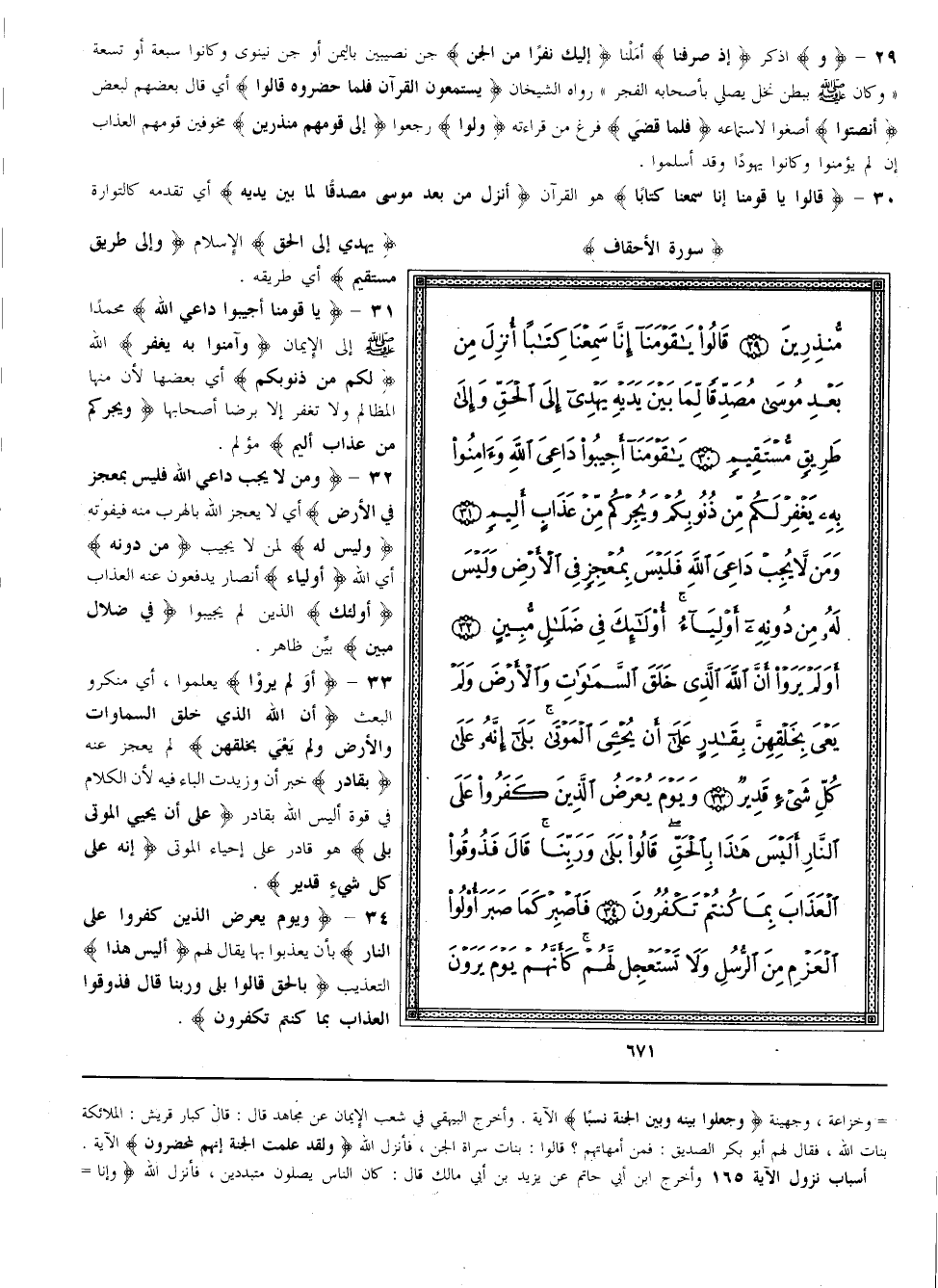{و} اذكر {إِذْ صَرَفْنَا} أَمَلْنَا {إلَيْك نَفَرًا مِنْ الْجِنّ} جِنّ نَصِيبِينَ بِالْيَمَنِ أَوْ جِنّ نِينَوَى وَكَانُوا سَبْعَة أَوْ تِسْعَة وَكَانَ صَلَّى اللَّه عَلَيْهِ وَسَلَّمَ بِبَطْنِ نَخْل يُصَلِّي بِأَصْحَابِهِ الْفَجْر رَوَاهُ الشَّيْخَانِ {يَسْتَمِعُونَ الْقُرْآن فَلَمَّا حَضَرُوهُ قَالُوا} أَيْ قَالَ بَعْضهمْ لِبَعْضٍ {أَنْصِتُوا} اصْغَوْا لِاسْتِمَاعِهِ {فَلَمَّا قُضِيَ} فُرِغَ مِنْ قِرَاءَته {وَلَّوْا} رَجَعُوا {إلَى قَوْمهمْ مُنْذِرِينَ} مُخَوِّفِينَ قَوْمهمْ الْعَذَاب إنْ لَمْ يُؤْمِنُوا وَكَانُوا يَهُودًا وَقَدْ أَسْلَمُوا
