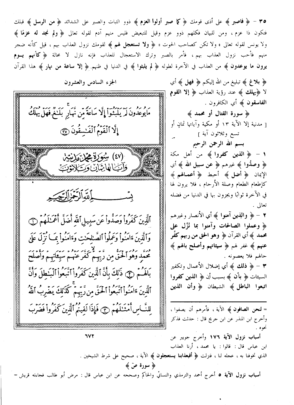 {فاصبر} على أذى قومك {كما صبر أولوا الْعَزْم} ذَوُو الثَّبَات وَالصَّبْر عَلَى الشَّدَائِد {مِنَ الرُّسُل} قَبْلك فَتَكُون ذَا عَزْم وَمِنْ لِلْبَيَانِ فَكُلّهمْ ذَوُو عَزْم وَقِيلَ لِلتَّبْعِيضِ فَلَيْسَ مِنْهُمْ آدَم لِقَوْلِهِ تَعَالَى {وَلَمْ نَجِد لَهُ عَزْمًا} وَلَا يُونُس لِقَوْلِهِ تَعَالَى وَلَا تَكُنْ كَصَاحِبِ الْحُوت {وَلَا تَسْتَعْجِل لَهُمْ} لِقَوْمِك نُزُول الْعَذَاب بِهِمْ قِيلَ كَأَنَّهُ ضَجِرَ مِنْهُمْ فَأَحَبَّ نُزُول الْعَذَاب بِهِمْ فَأُمِرَ بِالصَّبْرِ وَتَرْك الِاسْتِعْجَال لِلْعَذَابِ فإنه نازل لا محالة {كأنهم يوم يَرَوْنَ مَا يُوعَدُونَ} مِنْ الْعَذَاب فِي الْآخِرَة لِطُولِهِ {لَمْ يَلْبَثُوا} فِي الدُّنْيَا فِي ظَنّهمْ {إلا ساعة من نهار} هذا القرآن {بلاغ} تَبْلِيغ مِنْ اللَّه إلَيْكُمْ {فَهَلْ} أَيْ لَا {يُهْلَك} عِنْد رُؤْيَة الْعَذَاب {إلَّا الْقَوْم الْفَاسِقُونَ} أي الكافرون = 47 سورة القتال أو محمد