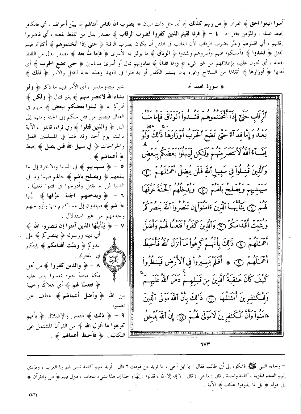 {فَإِذَا لَقِيتُمْ الَّذِينَ كَفَرُوا فَضَرْب الرِّقَاب} مَصْدَر بَدَل مِنْ اللَّفْظ بِفِعْلِهِ أَيْ فَاضْرِبُوا رِقَابهمْ أَيْ اُقْتُلُوهُمْ وَعَبَّرَ بِضَرْبِ الرِّقَاب لِأَنَّ الْغَالِب فِي الْقَتْل أَنْ يَكُون بِضَرْبِ الرَّقَبَة {حَتَّى إذَا أَثْخَنْتُمُوهُمْ} أَكْثَرْتُمْ فِيهِمْ الْقَتْل {فَشُدُّوا} فَأَمْسِكُوا عَنْهُمْ وَأْسِرُوهُمْ وَشُدُّوا {الْوَثَاق} مَا يُوثَق بِهِ الْأَسْرَى {فَإِمَّا مَنًّا بَعْد} مَصْدَر بَدَل مِنْ اللَّفْظ بِفِعْلِهِ أَيْ تَمُنُّونَ عَلَيْهِمْ بِإِطْلَاقِهِمْ مِنْ غَيْر شَيْء {وَإِمَّا فِدَاء} تُفَادُونَهُمْ بِمَالٍ أَوْ أَسْرَى مُسْلِمِينَ {حَتَّى تَضَع الْحَرْب} أَيْ أَهْلهَا {أَوْزَارهَا} أَثْقَالهَا مِنْ السِّلَاح وَغَيْره بِأَنْ يُسْلِم الْكُفَّار أَوْ يَدْخُلُوا فِي الْعَهْد وَهَذِهِ غَايَة لِلْقَتْلِ وَالْأَسْر {ذَلِكَ} خَبَر مُبْتَدَأ مُقَدَّر أَيْ الْأَمْر فِيهِمْ مَا ذُكِرَ {وَلَوْ يَشَاء اللَّه لَانْتَصَرَ مِنْهُمْ} بِغَيْرِ قِتَال {وَلَكِنْ} أَمَرَكُمْ بِهِ {ليبلوا بَعْضكُمْ بِبَعْضٍ} مِنْهُمْ فِي الْقِتَال فَيَصِير مَنْ قُتِلَ مِنْكُمْ إلَى الْجَنَّة وَمِنْهُمْ إلَى النَّار {وَاَلَّذِينَ قُتِلُوا} وَفِي قِرَاءَة قَاتَلُوا الْآيَة نَزَلَتْ يَوْم أُحُد وَقَدْ فَشَا فِي الْمُسْلِمِينَ الْقَتْل وَالْجِرَاحَات {فِي سَبِيل اللَّه فَلَنْ يُضِلّ} يُحْبِط {أعمالهم}
