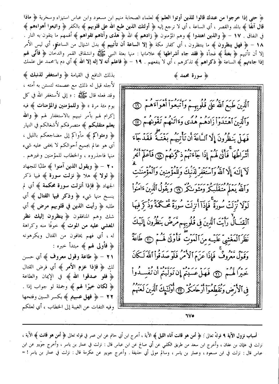 {وَيَقُول الَّذِينَ آمَنُوا} طَلَبًا لِلْجِهَادِ {لَوْلَا} هَلَّا {نُزِّلَتْ سُورَة} فِيهَا ذِكْر الْجِهَاد {فَإِذَا أُنْزِلَتْ سُورَة مُحْكَمَة} أَيْ لَمْ يُنْسَخ مِنْهَا شَيْء {وَذُكِرَ فِيهَا الْقِتَال} أَيْ طَلَبه {رَأَيْت الَّذِينَ فِي قُلُوبهمْ مَرَض} أَيْ شَكّ وَهُمْ الْمُنَافِقُونَ {يَنْظُرُونَ إلَيْك نَظَرَ الْمَغْشِيّ عَلَيْهِ مِنْ الْمَوْت} خَوْفًا مِنْهُ وَكَرَاهَة لَهُ أَيْ فَهُمْ يَخَافُونَ مِنْ الْقِتَال وَيَكْرَهُونَهُ {فَأَوْلَى لَهُمْ} مُبْتَدَأ خَبَره