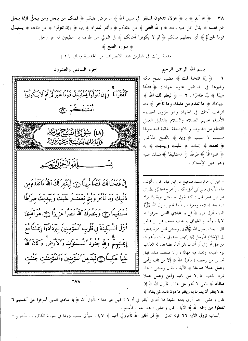 {هَا أَنْتُمْ} يَا {هَؤُلَاءِ تُدْعَوْنَ لِتُنْفِقُوا فِي سَبِيل اللَّه} مَا فُرِضَ عَلَيْكُمْ {فَمِنْكُمْ مَنْ يَبْخَل وَمَنْ يَبْخَل فَإِنَّمَا يَبْخَل عَنْ نَفْسه} يُقَال بَخِلَ عَلَيْهِ وَعَنْهُ {وَاَللَّه الْغَنِيّ} عَنْ نَفَقَتكُمْ {وَأَنْتُمْ الْفُقَرَاء} إلَيْهِ {وَإِنْ تَتَوَلَّوْا} عَنْ طَاعَته {يَسْتَبْدِل قَوْمًا غَيْركُمْ} أَيْ يَجْعَلهُمْ بَدَلكُمْ {ثُمَّ لَا يَكُونُوا أَمْثَالكُمْ} فِي التَّوَلِّي عَنْ طَاعَته بَلْ مُطِيعِينَ لَهُ عَزَّ وَجَلَّ = 48 سُورَة الفتح