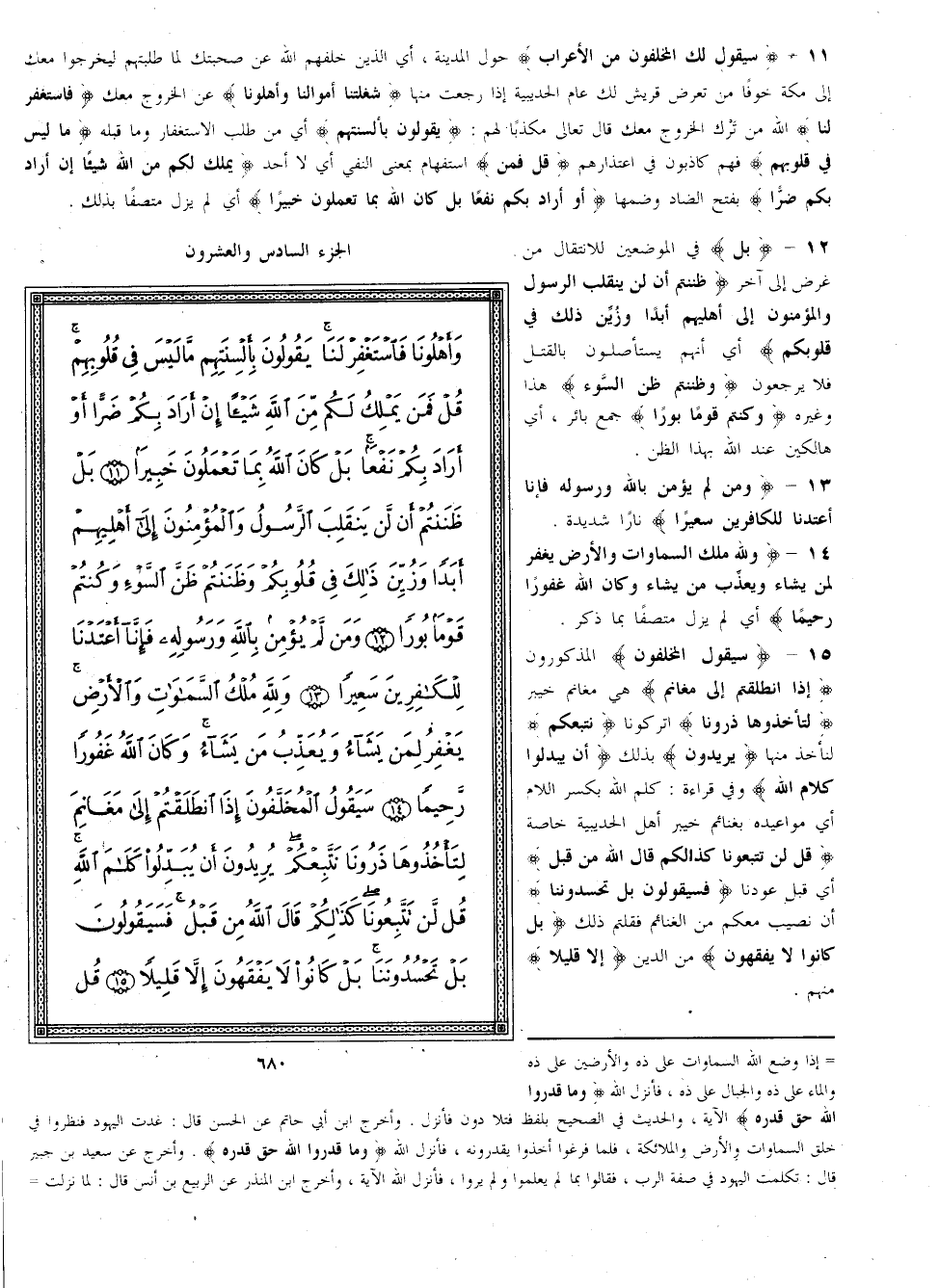 {سَيَقُولُ لَك الْمُخَلَّفُونَ مِنَ الْأَعْرَاب} حَوْل الْمَدِينَة أَيْ الَّذِينَ خَلَّفَهُمْ اللَّه عَنْ صُحْبَتك لَمَّا طَلَبْتهمْ لِيَخْرُجُوا مَعَك إلَى مَكَّة خَوْفًا مِنْ تَعَرُّض قُرَيْش لَك عَام الْحُدَيْبِيَة إذَا رَجَعْت مِنْهَا {شَغَلَتْنَا أَمْوَالنَا وَأَهْلُونَا} عَنْ الْخُرُوج مَعَك {فَاسْتَغْفِرْ لَنَا} اللَّه مِنْ تَرْك الْخُرُوج مَعَك قَالَ تَعَالَى مُكَذِّبًا لَهُمْ {يَقُولُونَ بِأَلْسِنَتِهِمْ} أَيْ مِنْ طَلَب الِاسْتِغْفَار وَمَا قَبْله {مَا لَيْسَ فِي قُلُوبهمْ} فَهُمْ كَاذِبُونَ فِي اعْتِذَارهمْ {قُلْ فَمَنْ} اسْتِفْهَام بِمَعْنَى النَّفْي أَيْ لَا أَحَد {يَمْلِك لَكُمْ مِنَ اللَّه شَيْئًا إنْ أَرَادَ بِكُمْ ضَرًّا} بِفَتْحِ الضَّاد وَضَمّهَا {أَوْ أَرَادَ بِكُمْ نَفْعًا بَلْ كَانَ اللَّه بِمَا تَعْمَلُونَ خَبِيرًا} أَيْ لَمْ يَزَلْ مُتَّصِفًا بِذَلِكَ