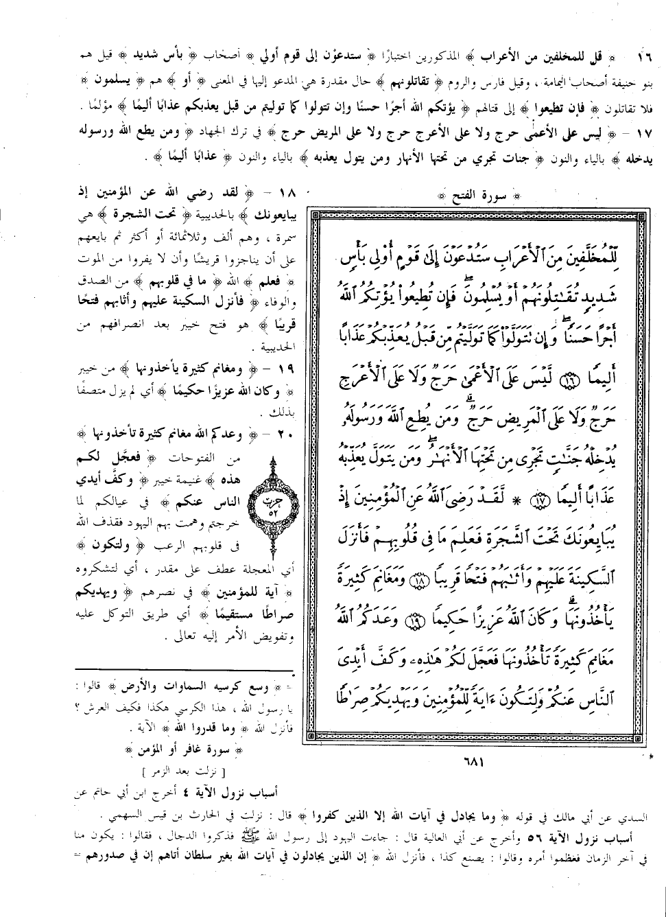{لَقَدْ رَضِيَ اللَّه عَنِ الْمُؤْمِنِينَ إذْ يُبَايِعُونَك} بِالْحُدَيْبِيَةِ {تَحْت الشَّجَرَة} هِيَ سَمُرَة وَهُمْ أَلْف وثلاثمائة أَوْ أَكْثَر ثُمَّ بَايَعَهُمْ عَلَى أَنْ يُنَاجِزُوا قُرَيْشًا وَأَنْ لَا يَفِرُّوا مِنْ الْمَوْت {فَعَلِمَ} اللَّه {مَا فِي قُلُوبهمْ} مِنْ الصِّدْق وَالْوَفَاء {فَأَنْزَلَ السَّكِينَة عَلَيْهِمْ وَأَثَابَهُمْ فَتْحًا قَرِيبًا} هُوَ فَتْح خَيْبَر بَعْد انْصِرَافهمْ مِنْ الْحُدَيْبِيَة
