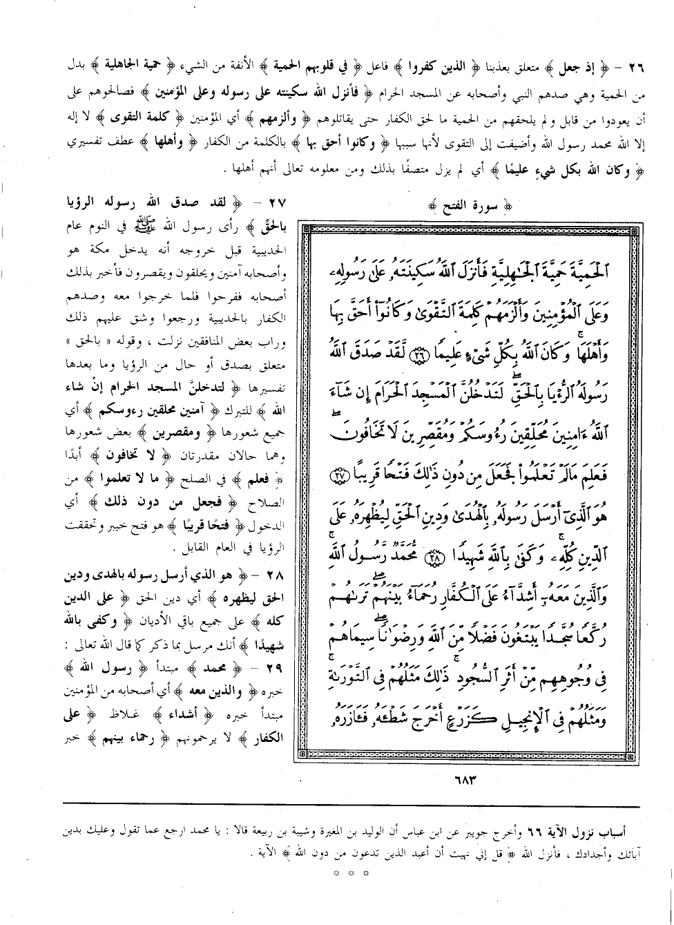 {لَقَدْ صَدَقَ اللَّه رَسُوله الرُّؤْيَا بِالْحَقِّ} رَأَى رَسُول اللَّه صَلَّى اللَّه عَلَيْهِ وَسَلَّمَ فِي النَّوْم عَام الْحُدَيْبِيَة قَبْل خُرُوجه أَنَّهُ يَدْخُل مَكَّة هُوَ وَأَصْحَابه آمِنِينَ وَيَحْلِقُونَ وَيُقَصِّرُونَ فَأَخْبَرَ بِذَلِكَ أَصْحَابه فَفَرِحُوا فَلَمَّا خَرَجُوا مَعَهُ وَصَدَّهُمْ الْكُفَّار بِالْحُدَيْبِيَةِ وَرَجَعُوا وَشَقَّ عَلَيْهِمْ ذَلِكَ وَرَابَ بَعْض الْمُنَافِقِينَ نَزَلَتْ وَقَوْله بِالْحَقِّ مُتَعَلِّق بِصَدَقَ أو حال من الرؤيا وما بعدها تفسيرها {لَتَدْخُلُنَّ الْمَسْجِد الْحَرَام إنْ شَاءَ اللَّه} لِلتَّبَرُّكِ {آمِنِينَ مُحَلِّقِينَ رُءُوسكُمْ} أَيْ جَمِيع شُعُورهَا {وَمُقَصِّرِينَ} بَعْض شُعُورهَا وَهُمَا حَالَانِ مُقَدَّرَتَانِ {لَا تَخَافُونَ} أبدا {فعلم} في الصلح {ما لا تَعْلَمُوا} مِنْ الصَّلَاح {فَجَعَلَ مِنْ دُون ذَلِكَ} أَيْ الدُّخُول {فَتْحًا قَرِيبًا} هُوَ فَتْح خَيْبَر وَتَحَقَّقَتْ الرُّؤْيَا فِي الْعَام الْقَابِل