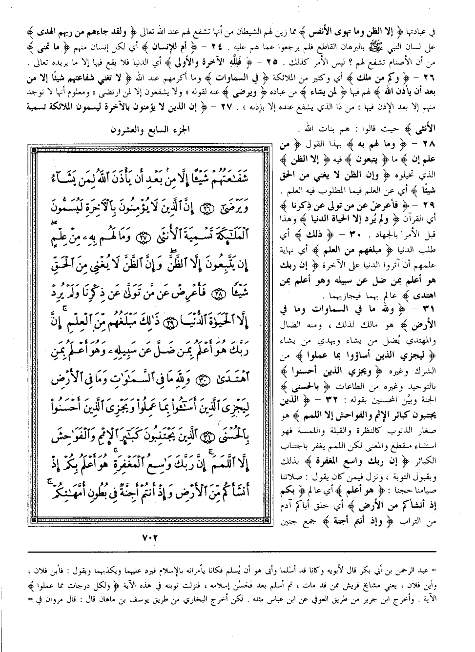 {إنْ هِيَ} أَيْ مَا الْمَذْكُورَات {إلَّا أَسْمَاء سميتموها} أي سميتم بها {أنتم وآباؤكم} أَصْنَامًا تَعْبُدُونَهَا {مَا أَنْزَلَ اللَّه بِهَا} أَيْ بِعِبَادَتِهَا {مِنْ سُلْطَان} حُجَّة وَبُرْهَان {إنْ} مَا {يَتَّبِعُونَ} فِي عِبَادَتهَا {إلَّا الظَّنّ وَمَا تَهْوَى الْأَنْفُس} مِمَّا زَيَّنَ لَهُمْ الشَّيْطَان مِنْ أَنَّهَا تَشْفَع لَهُمْ عِنْد اللَّه تَعَالَى {وَلَقَدْ جَاءَهُمْ مِنْ رَبِّهُمُ الْهُدَى} عَلَى لِسَان النَّبِيّ صَلَّى اللَّه عَلَيْهِ وَسَلَّمَ بِالْبُرْهَانِ الْقَاطِع فَلَمْ يَرْجِعُوا عَمَّا هُمْ عَلَيْهِ