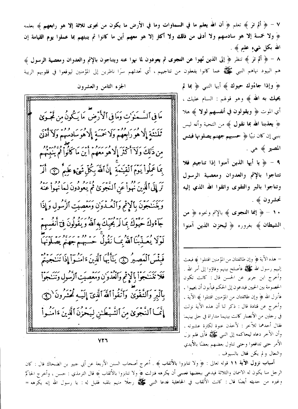 {أَلَمْ تَرَ} تَنْظُر {إلَى الَّذِينَ نُهُوا عَنْ النَّجْوَى ثُمَّ يَعُودُونَ لِمَا نُهُوا عَنْهُ وَيَتَنَاجَوْنَ بِالْإِثْمِ وَالْعُدْوَان وَمَعْصِيَة الرَّسُول} هُمْ الْيَهُود نَهَاهُمْ النَّبِيّ صَلَّى اللَّه عَلَيْهِ وَسَلَّمَ عَمَّا كَانُوا يَفْعَلُونَ مِنْ تَنَاجِيهمْ أَيْ تَحَدُّثهمْ سِرًّا نَاظِرِينَ إلَى الْمُؤْمِنِينَ لِيُوقِعُوا فِي قُلُوبهمْ الرِّيبَة {وَإِذَا جاءوك حيوك} أيها النبي {بِمَا لَمْ يُحَيِّك بِهِ اللَّه} وَهُوَ قَوْلهمْ السَّام عَلَيْك أَيْ الْمَوْت {وَيَقُولُونَ فِي أَنْفُسهمْ لولا} هلا {يعذبنا الله بِمَا نَقُول} مِنْ التَّحِيَّة وَأَنَّهُ لَيْسَ بِنَبِيٍّ إنْ كَانَ نَبِيًّا {حَسْبهمْ جَهَنَّم يَصْلَوْنَهَا فَبِئْسَ المصير} هي
