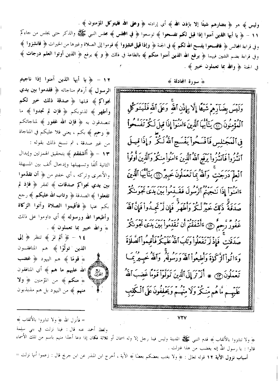 {أَأَشْفَقْتُمْ} بِتَحْقِيقِ الْهَمْزَتَيْنِ وَإِبْدَال الثَّانِيَة أَلِفًا وَتَسْهِيلهَا وَإِدْخَال ألف بين المسهلة والأخرى وتركه أي خِفْتُمْ مِنْ {أَنْ تُقَدِّمُوا بَيْن يَدَيْ نَجْوَاكُمْ صَدَقَات} لِفَقْرٍ {فَإِذْ لَمْ تَفْعَلُوا} الصَّدَقَة {وَتَابَ اللَّه عَلَيْكُمْ} رَجَعَ بِكُمْ عَنْهَا {فَأَقِيمُوا الصَّلَاة وَآتُوا الزَّكَاة وَأَطِيعُوا اللَّه وَرَسُوله} أَيْ دَاوِمُوا على ذلك {والله خبير بما تعملون