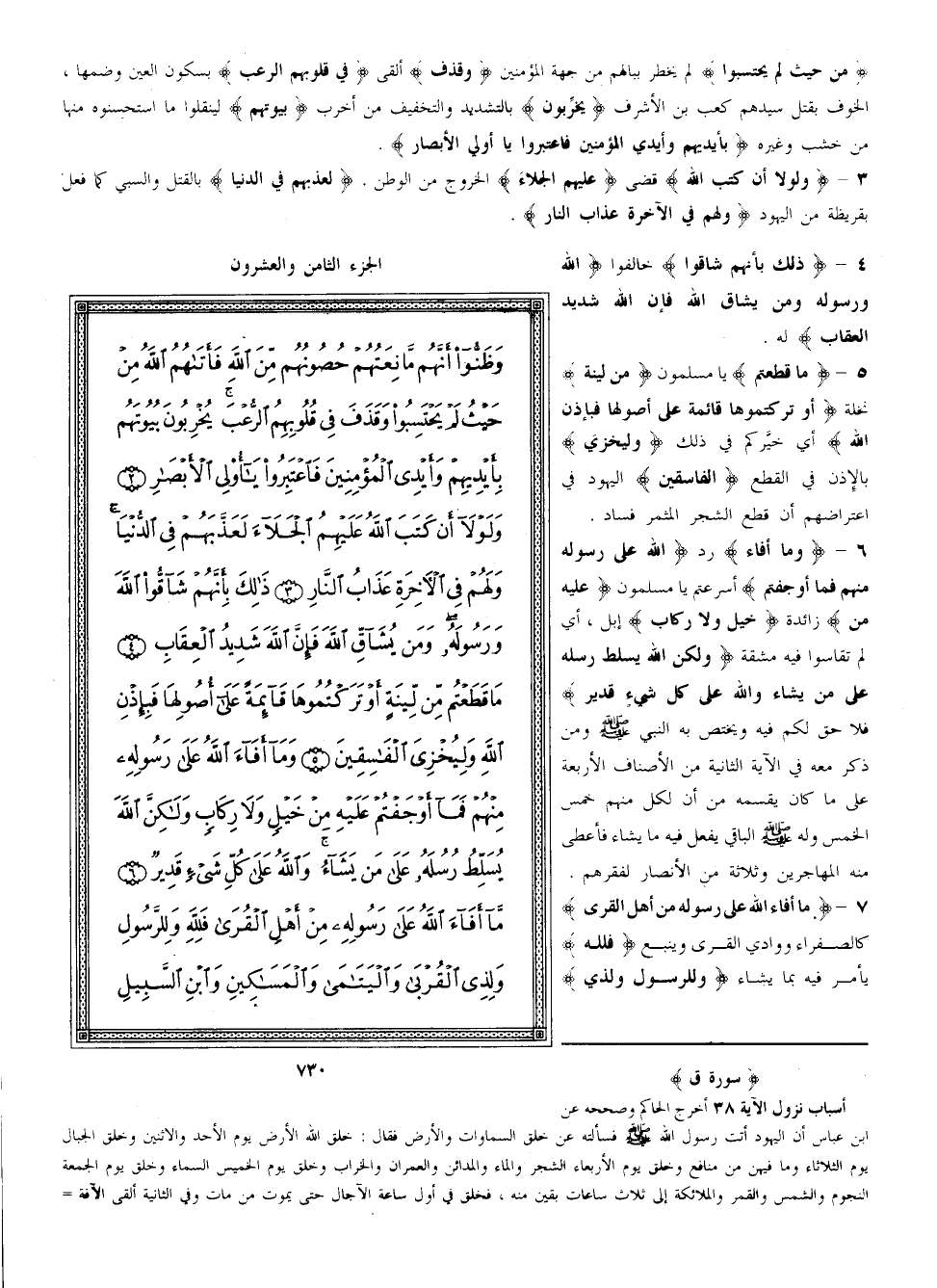 {هُوَ الَّذِي أَخَرَجَ الَّذِينَ كَفَرُوا مِنْ أَهْل الْكِتَاب} هُمْ بَنُو النَّضِير مِنْ الْيَهُود {مِنْ دِيَارهمْ} مَسَاكِنهمْ بِالْمَدِينَةِ {لِأَوَّلِ الْحَشْر} هُوَ حَشْرهمْ إلَى الشَّام وَآخِره أَنْ أَجْلَاهُمْ عُمَر فِي خِلَافَته إلَى خَيْبَر {مَا ظَنَنْتُمْ} أَيّهَا الْمُؤْمِنُونَ {أَنْ يَخْرُجُوا وَظَنُّوا أَنَّهُمْ مَانِعَتهمْ} خَبَر أَنْ {حُصُونهمْ} فَاعِله تَمَّ بِهِ الْخَبَر {مِنْ اللَّه} مِنْ عَذَابه {فَأَتَاهُمْ اللَّه} أَمْره وَعَذَابه {مِنْ حَيْثُ لَمْ يَحْتَسِبُوا} لَمْ يَخْطِر بِبَالِهِمْ مِنْ جِهَة الْمُؤْمِنِينَ {وَقَذَفَ} أَلْقَى {فِي قُلُوبهمْ الرُّعْب} بِسُكُونِ الْعَيْن وَضَمّهَا الْخَوْف بِقَتْلِ سَيِّدهمْ كَعْب بْن الْأَشْرَف {يُخْرِبُونَ} بِالتَّشْدِيدِ وَالتَّخْفِيف مِنْ أَخْرَبَ {بُيُوتهمْ} لِيَنْقُلُوا مَا اسْتَحْسَنُوهُ مِنْهَا مِنْ خَشَب وغيره {بأيديهم وأيدي المؤمنين فاعتبروا يا أولي الأبصار}