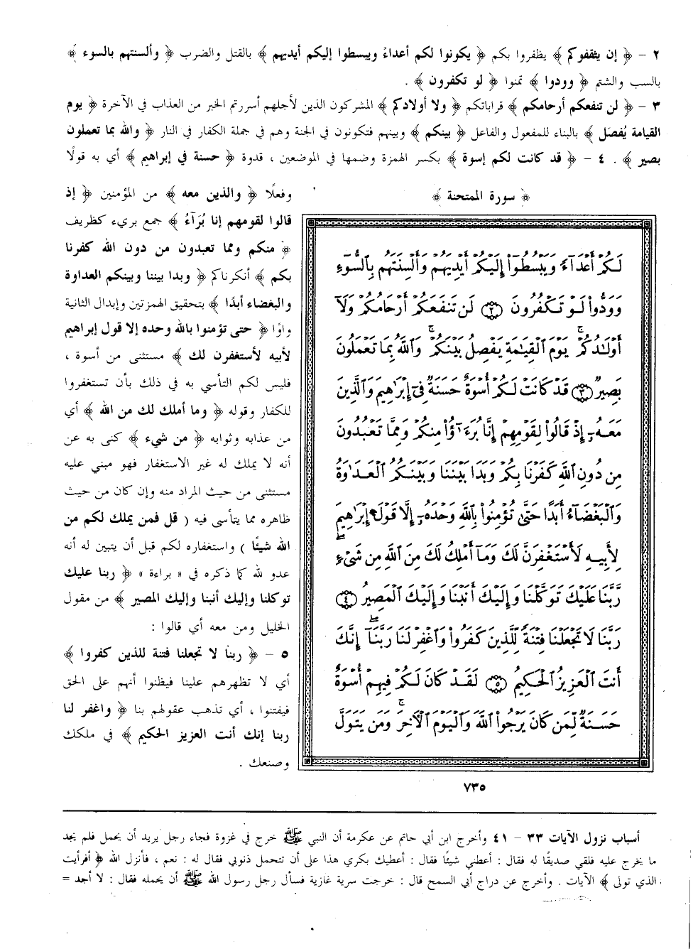 {قَدْ كَانَتْ لَكُمْ إِسْوَة} بِكَسْرِ الْهَمْزَة وَضَمّهَا فِي الْمَوْضِعَيْنِ قُدْوَة {حَسَنَة فِي إبْرَاهِيم} أَيْ بِهِ قَوْلًا وَفِعْلًا {وَاَلَّذِينَ مَعَهُ} مِنْ الْمُؤْمِنِينَ {إذْ قَالُوا لِقَوْمِهِمْ إنَّا بُرَآء} جَمْع بَرِيء كَظَرِيفٍ {مِنْكُمْ وَمِمَّا تَعْبُدُونَ مِنْ دُون اللَّه كَفَرْنَا بِكُمْ} أَنْكَرْنَاكُمْ {وَبَدَا بَيْننَا وَبَيْنكُمْ الْعَدَاوَة وَالْبَغْضَاء أَبَدًا} بِتَحْقِيقِ الْهَمْزَتَيْنِ وَإِبْدَال الثَّانِيَة وَاوًا {حَتَّى تُؤْمِنُوا بِاَللَّهِ وَحْده إلَّا قَوْل إبْرَاهِيم لِأَبِيهِ لَأَسْتَغْفِرَن لَك} مُسْتَثْنَى مِنْ أُسْوَة فَلَيْسَ لَكُمْ التَّأَسِّي بِهِ فِي ذَلِكَ بِأَنْ تَسْتَغْفِرُوا لِلْكُفَّارِ وَقَوْله {وَمَا أَمْلِك لَك مِنْ اللَّه} أَيْ مِنْ عَذَابه وَثَوَابه {مِنْ شَيْء} كَنَّى بِهِ عَنْ أَنَّهُ لَا يَمْلِك لَهُ غَيْر الِاسْتِغْفَار فَهُوَ مَبْنِيّ عَلَيْهِ مُسْتَثْنَى مِنْ حَيْثُ الْمُرَاد مِنْهُ وَإِنْ كَانَ مِنْ حَيْثُ ظَاهِره مِمَّا يُتَأَسَّى فِيهِ {قُلْ فَمَنْ يَمْلِك لَكُمْ من الله شيئا} واستغفاره لكم قَبْل أَنْ يَتَبَيَّن لَهُ أَنَّهُ عَدُوّ لِلَّهِ كَمَا ذَكَرَهُ فِي بَرَاءَة {رَبّنَا عَلَيْك تَوَكَّلْنَا وَإِلَيْك أَنَبْنَا وَإِلَيْك الْمَصِير} مِنْ مَقُول الْخَلِيل وَمَنْ مَعَهُ أَيْ قَالُوا