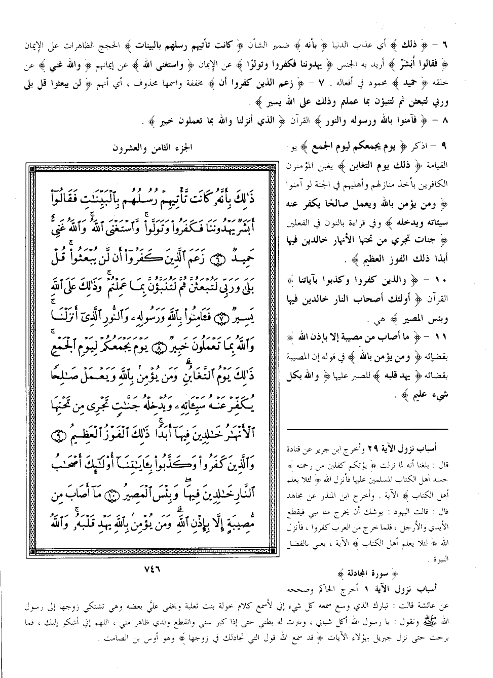 اذكر {يَوْم يَجْمَعكُمْ لِيَوْمِ الْجَمْع} يَوْم الْقِيَامَة {ذَلِكَ يَوْم التَّغَابُن} يَغْبِن الْمُؤْمِنُونَ الْكَافِرِينَ بِأَخْذِ مَنَازِلهمْ وَأَهْلِيهِمْ فِي الْجَنَّة لَوْ آمَنُوا {وَمَنْ يُؤْمِن بِاَللَّهِ وَيَعْمَل صَالِحًا يُكَفَّر عَنْهُ سَيِّئَاته وَيُدْخِلهُ} وفي قراءة بالنون في الفعلين {جَنَّات تَجْرِي مِنْ تَحْتهَا الْأَنْهَار خَالِدِينَ فِيهَا أبدا ذلك الفوز العظيم}