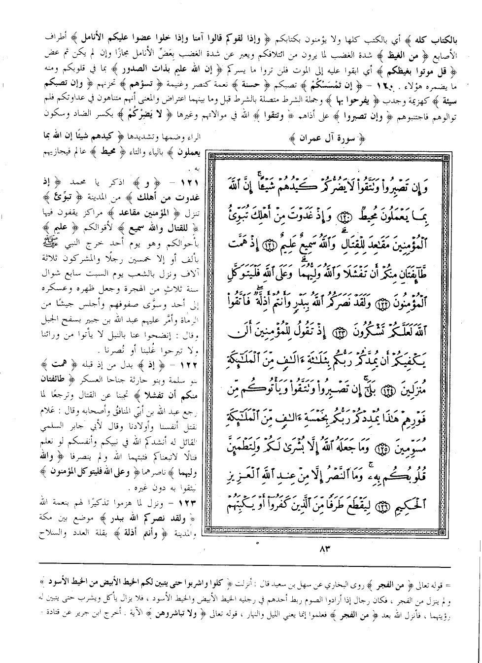 {إذْ} بَدَل مِنْ إذْ قَبْله {هَمَّتْ} بَنُو سَلَمَة وَبَنُو حَارِثَة جَنَاحَا الْعَسْكَر {طَائِفَتَانِ مِنْكُمْ أَنْ تَفْشَلَا} تَجْبُنَا عَنْ الْقِتَال وَتَرْجِعَا لَمَّا رَجَعَ عَبْد اللَّه بْن أُبَيٍّ الْمُنَافِق وَأَصْحَابه وَقَالَ عَلَام نَقْتُل أَنْفُسنَا وَأَوْلَادنَا وَقَالَ لِأَبِي جَابِر السُّلَمِيّ الْقَائِل لَهُ أَنْشُدكُمْ اللَّه فِي نَبِيّكُمْ وَأَنْفُسكُمْ لَوْ نَعْلَم قِتَالًا لَاتَّبَعْنَاكُمْ فَثَبَّتَهُمَا اللَّه وَلَمْ يَنْصَرِفَا {وَاَللَّه وَلِيّهمَا} نَاصِرهمَا {وَعَلَى اللَّه فَلْيَتَوَكَّلْ الْمُؤْمِنُونَ} لِيَثِقُوا بِهِ دُون غَيْره
