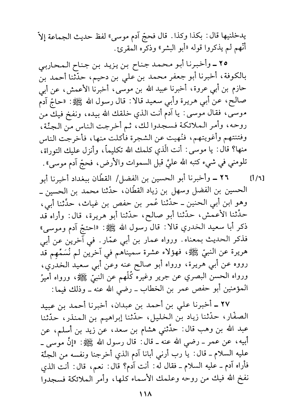 26 - وَأَخْبَرَنَا أَبُو الْحُسَيْنِ بْنُ الْفَضْلِ الْقَطَّانُ، بِبَغْدَادَ، وَسَهْلُ بْنُ زِيَادٍ الْقَطَّانُ، حَدَّثَنَا مُحَمَّدُ بْنُ الْحُسَيْنِ وَهُوَ ابْنُ أَبِي الْحُنَيْنِ حَدَّثَنَا عُمَرُ بْنُ حَفْصِ بْنِ غِيَاثٍ، حَدَّثَنَا أَبِي، حَدَّثَنَا الْأَعْمَشُ، حَدَّثَنَا أَبُو صَالِحٍ، حَدَّثَنَا أَبُو هُرَيْرَةَ، قَالَ: وَأُرَاهُ قَدْ ذَكَرَ أَبَا سَعِيدٍ الْخُدْرِيَّ قَالَا: قَالَ رَسُولُ اللَّهِ صَلَّى اللهُ عَلَيْهِ وَسَلَّمَ: «احْتَجَّ آدَمُ وَمُوسَى» فَذَكَرَ الْحَدِيثَ بِمَعْنَاهُ وَرَوَاهُ عَمَّارُ بْنُ أَبِي عَمَّارٍ فِي آخَرِينَ، عَنْ أَبِي هُرَيْرَةَ عَنِ النَّبِيِّ صَلَّى اللهُ عَلَيْهِ وَسَلَّمَ فَهَؤُلَاءِ عَشْرَةٌ سَمَّيْنَاهُمْ فِي آخَرِينَ لَمْ نُسَمِّهِمْ قَدْ رَوَوْهُ عَنْ أَبِي هُرَيْرَةَ، وَرَوَاهُ أَبُو صَالِحٍ عَنْهُ وَعَنْ أَبِي سَعِيدٍ الْخُدْرِيِّ وَرَوَاهُ أَبُو الْحَسَنِ الْبَصْرِيُّ عَنْ جَرِيرٍ وَغَيْرِهِ كُلُّهُمْ عَنِ النَّبِيِّ صَلَّى اللهُ عَلَيْهِ وَسَلَّمَ وَرَوَاهُ أَمِيرُ الْمُؤْمِنِينَ أَبُو حَفْصٍ عُمَرُ بْنُ الْخَطَّابِ رَضِيَ اللَّهُ عَنْهُ