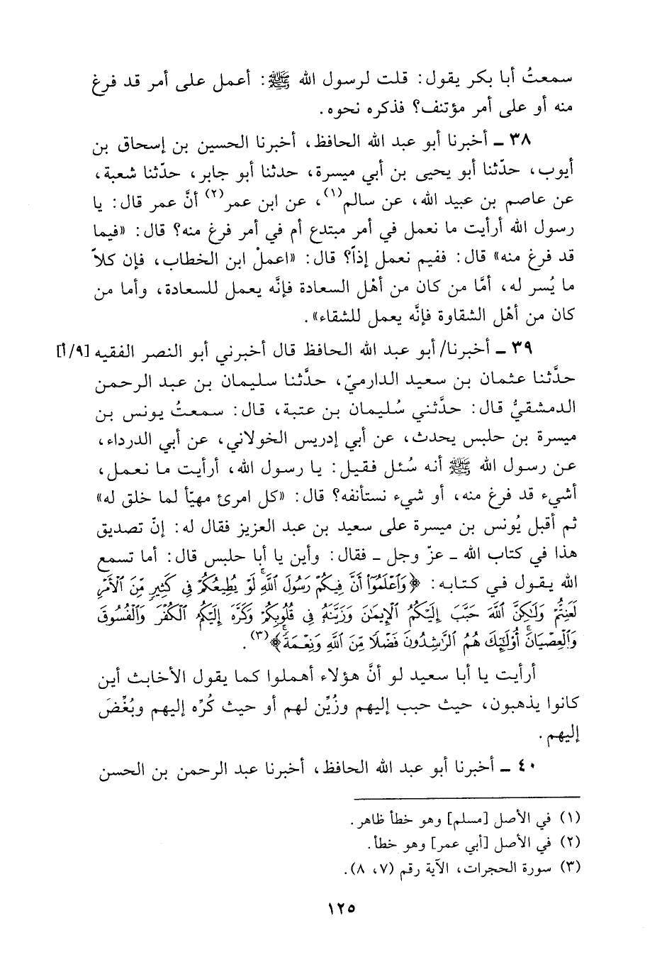 39 - أَخْبَرَنَا أَبُو عَبْدِ اللَّهِ الْحَافِظُ، قَالَ: أَخْبَرَنِي أَبُو النَّصْرِ الْفَقِيهُ، حَدَّثَنَا عُثْمَانُ بْنُ سَعِيدٍ الدَّارِمِيُّ، حَدَّثَنَا سُلَيْمَانُ بْنُ عَبْدِ الرَّحْمَنِ الدِّمَشْقِيُّ، قَالَ: حَدَّثَنِي سُلَيْمَانُ بْنُ عُتْبَةَ، قَالَ: سَمِعْتُ يُونُسَ بْنَ مَيْسَرَةَ بْنِ حَلْبَسٍ، يُحَدِّثُ عَنْ أَبِي إِدْرِيسَ الْخَوْلَانِيِّ، عَنْ أَبِي الدَّرْدَاءِ، عَنْ رَسُولِ اللَّهِ صَلَّى اللهُ عَلَيْهِ وَسَلَّمَ أَنَّهُ سُئِلَ فَقِيلَ: يَا رَسُولَ اللَّهِ أَرَأَيْتَ مَا نَعْمَلُ أَشَيْءٌ قَدْ فُرِغَ مِنْهُ، أَوْ شَيْءٌ نَسْتَأْنِفُهُ؟ قَالَ: §«كُلُّ امْرِئٍ مُهَيَّأٌ لِمَا خُلِقَ لَهُ» ثُمَّ أَقْبَلَ يُونُسُ بْنُ مَيْسَرَةَ عَلَى سَعِيدِ بْنِ عَبْدِ الْعَزِيزِ فَقَالَ لَهُ: إِنَّ تَصْدِيقَ هَذَا فِي كِتَابِ اللَّهِ عَزَّ وَجَلَّ، فَقَالَ: وَأَيْنَ يَا أَبَا حَلْبَسٍ قَالَ: أَمَا تَسْمَعُ اللَّهَ يَقُولُ فِي كِتَابِهِ: {وَاعْلَمُوا أَنَّ فِيكُمْ رَسُولَ اللَّهِ لَوْ يُطِيعُكُمْ فِي كَثِيرٍ مِنَ الْأَمْرِ لَعَنِتُّمْ وَلَكِنَّ اللَّهَ حَبَّبَ إِلَيْكُمُ الْإِيمَانَ وَزَيَّنَهُ فِي قُلُوبِكُمْ وَكَرَّهَ إِلَيْكُمُ الْكُفْرَ وَالْفُسُوقَ وَالْعِصْيَانَ أُولَئِكَ هُمُ الرَّاشِدُونَ فَضْلًا مِنَ اللَّهِ وَنِعْمَةً} [الحجرات: 8] . أَرَأَيْتَ يَا أَبَا سَعِيدٍ لَوْ أَنَّ هَؤُلَاءِ أُهْمِلُوا كَمَا يَقُولُ الْأَخَابِثُ أَيْنَ كَانُوا يَذْهَبُونَ، حَيْثُ حُبِّبَ إِلَيْهِمْ وَزُيِّنَ لَهُمْ أَوْ حَيْثُ كُرِّهَ إِلَيْهِمْ وَبُغِّضَ إِلَيْهِمْ