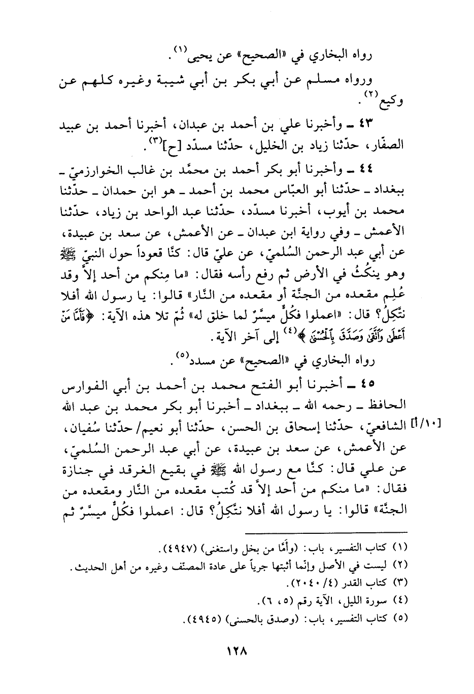 45 - أَخْبَرَنَا أَبُو الْفَتْحِ مُحَمَّدُ بْنُ أَحْمَدَ بْنِ أَبِي الْفَوَارِسِ الْحَافِظُ رَحِمَهُ اللَّهُ بِبَغْدَادَ، أَخْبَرَنَا أَبُو بَكْرٍ مُحَمَّدُ بْنُ عَبْدِ اللَّهِ الشَّافِعِيُّ، حَدَّثَنَا إِسْحَاقُ بْنُ الْحَسَنِ، حَدَّثَنَا أَبُو نُعَيْمٍ، حَدَّثَنَا سُفْيَانُ، عَنِ الْأَعْمَشِ، عَنْ سَعْدِ بْنِ عُبَيْدَةَ، عَنْ أَبِي عَبْدِ الرَّحْمَنِ السُّلَمِيِّ، عَنْ عَلِيٍّ، قَالَ: كُنَّا مَعَ رَسُولِ اللَّهِ صَلَّى اللهُ عَلَيْهِ وَسَلَّمَ فِي بَقِيعِ الْغَرْقَدِ فِي جِنَازَةٍ، فَقَالَ: «مَا مِنْكُمْ مِنْ أَحَدٍ إِلَّا قَدْ كُتِبَ مَقْعَدُهُ مِنَ النَّارِ وَمَقْعَدُهُ مِنَ الْجَنَّةِ» ، قَالُوا: يَا رَسُولَ اللَّهِ أَفَلَا نَتَّكِلُ؟ قَالَ: " §اعْمَلُوا فَكُلٌّ مُيَسَّرٌ - ثُمَّ -[129]- قَرَأَ -: {فَأَمَّا مَنْ أَعْطَى وَاتَّقَى وَصَدَّقَ بِالْحُسْنَى، فَسَنُيَسِّرُهُ لِلْيُسْرَى، وَأَمَّا مَنْ بَخِلَ وَاسْتَغْنَى وَكَذَّبَ بِالْحُسْنَى، فَسَنُيَسِّرُهُ لِلْعُسْرَى} [الليل: 6] " رَوَاهُ الْبُخَارِيُّ عَنْ أَبِي نُعَيْمٍ