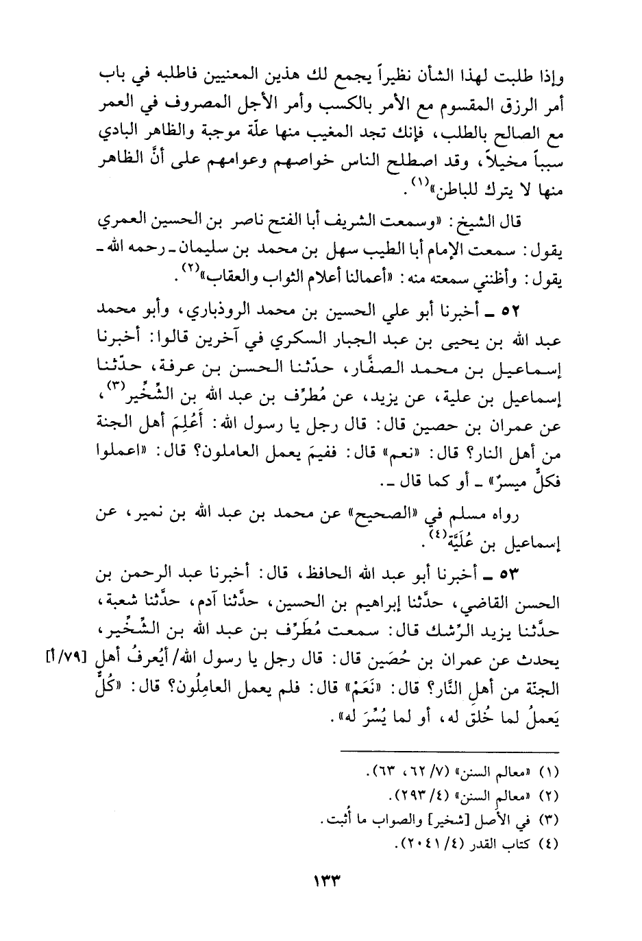 52 - أَخْبَرَنَا أَبُو عَلِيٍّ الْحُسَيْنُ بْنُ مُحَمَّدٍ الرُّوذْبَارِيُّ، وَأَبُو مُحَمَّدٍ عَبْدُ اللَّهِ بْنُ يَحْيَى بْنِ عَبْدِ الْجَبَّارِ السُّكَّرِيُّ فِي آخَرِينَ قَالُوا: أَخْبَرَنَا إِسْمَاعِيلُ بْنُ مُحَمَّدٍ الصَّفَّارُ، حَدَّثَنَا الْحَسَنُ بْنُ عَرَفَةَ، حَدَّثَنَا إِسْمَاعِيلُ ابْنُ عُلَيَّةَ، عَنْ يَزِيدَ، عَنْ مُطَرِّفِ بْنِ عَبْدِ اللَّهِ بْنِ الشِّخِّيرِ، عَنْ عِمْرَانَ بْنِ حُصَيْنٍ، قَالَ: قَالَ رَجُلٌ يَا رَسُولَ اللَّهِ: أَعُلِمَ أَهْلُ الْجَنَّةِ مِنْ أَهْلِ النَّارِ؟ قَالَ: «نَعَمْ» ، قَالَ: فَفِيمَ يَعْمَلُ الْعَامِلُونَ؟ قَالَ: «§اعْمَلُوا فَكُلٌّ مُيَسَّرٌ» ، أَوْ كَمَا قَالَ رَوَاهُ مُسْلِمٌ فِي الصَّحِيحِ عَنْ مُحَمَّدِ بْنِ عَبْدِ اللَّهِ بْنِ نُمَيْرٍ، عَنْ إِسْمَاعِيلَ ابْنِ عُلَيَّةَ