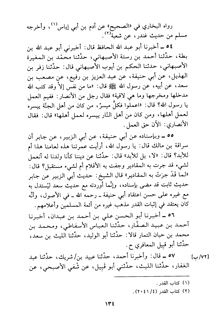 55 - وَبِإِسْنَادِهِ عَنْ أَبِي حَنِيفَةَ، عَنْ أَبِي الزُّبَيْرِ، عَنْ جَابِرٍ، أَنَّ سُرَاقَةَ بْنَ مَالِكٍ قَالَ: يَا رَسُولَ اللَّهِ أَرَأَيْتَ عُمْرَتَنَا هَذِهِ لِعَامِنَا هَذَا أَمْ لِلْأَبَدِ؟ قَالَ: «لَا بَلْ لِلْأَبَدِ» ، قَالَ: حَدِّثْنَا عَنْ دِينِنَا كَأَنَّا وُلِدْنَا لَهُ أَنَعْمَلُ لِشَيْءٍ قَدْ جَرَتْ بِهِ الْمَقَادِيرُ وَجَفَّتْ بِهِ الْأَقْلَامُ أَمْ لِشَيْءٍ مُسْتَقْبَلٍ؟ قَالَ: «§لِمَا قَدْ جَرَتْ بِهِ الْمَقَادِيرُ» قَالَ الشَّيْخُ: حَدِيثُ أَبِي الزُّبَيْرِ، عَنْ جَابِرٍ حَدِيثٌ ثَابِتٌ قَدْ مَضَى بِإِسْنَادِهِ، وَإِنَّمَا أَوْرَدْتُهُ مَعَ حَدِيثِ سَعْدٍ لِيُسْتَدَلَّ بِهِ مَعَ غَيْرِهِ عَلَى حُسْنِ اعْتِقَادِ أَبِي حَنِيفَةَ رَحِمَهُ اللَّهُ فِي الْأُصُولِ، وَأَنَّهُ كَانَ يَعْتَقِدُ فِي إِثْبَاتِ الْقَدَرِ مَذْهَبَ غَيْرِهِ مِنْ أَئِمَّةِ الْمُسْلِمِينَ وَأَعْلَامِهِمْ