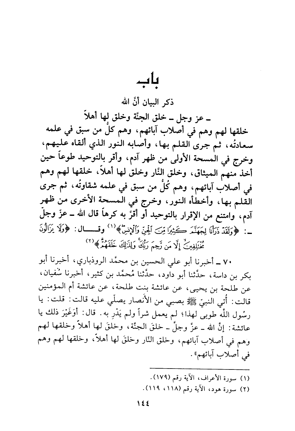 §بَابُ ذِكْرِ الْبَيَانِ أَنَّ اللَّهَ عَزَّ وَجَلَّ خَلَقَ الْجَنَّةَ وَخَلَقَ لَهَا أَهْلًا خَلَقَهَا لَهُمْ وَهُمْ فِي أَصْلَابِ آبَائِهِمْ وَهُمْ كُلُّ مَنْ سَبَقَ فِي عِلْمِهِ سَعَادَتُهُ، ثُمَّ جَرَى الْقَلَمُ بِهَا، وَأَصَابَهُ النُّورُ الَّذِي أَلْقَاهُ عَلَيْهِمْ، وَخَرَجَ فِي الْمَسْحَةِ الْأُولَى مِنْ ظَهْرِ آدَمَ، وَأَقَرَّ بِالتَّوْحِيدِ طَوْعًا حِينَ أَخَذَ مِنْهُمُ الْمِيثَاقَ، وَخَلَقَ النَّارَ وَخَلَقَ لَهَا أَهْلًا، وَخَلَقَهَا لَهُمْ وَهُمْ فِي أَصْلَابِ آبَائِهِمْ، وَهُمْ كُلُّ مَنْ سَبَقَ فِي عِلْمِهِ شَقَاوَتُهُ، ثُمَّ جَرَى الْقَلَمُ بِهَا، وَأَخْطَأَهُ النُّورُ، وَخَرَجَ فِي الْمَسْحَةِ الْأُخْرَى مِنْ ظَهْرِ آدَمَ، وَامْتَنَعَ مِنَ الْإِقْرَارِ بِالتَّوْحِيدِ أَوْ أَقَرَّ بِهِ كَرْهًا قَالَ اللَّهُ عَزَّ وَجَلَّ: {وَلَقَدْ ذَرَأْنَا لِجَهَنَّمَ كَثِيرًا مِنَ الْجِنِّ وَالْإِنْسِ} [الأعراف: 179] وَقَالَ: {وَلَا يَزَالُونَ مُخْتَلِفَيْنِ إِلَّا مَنْ رَحِمَ رَبُّكَ وَلِذَلِكَ خَلَقَهُمْ} [هود: 119]