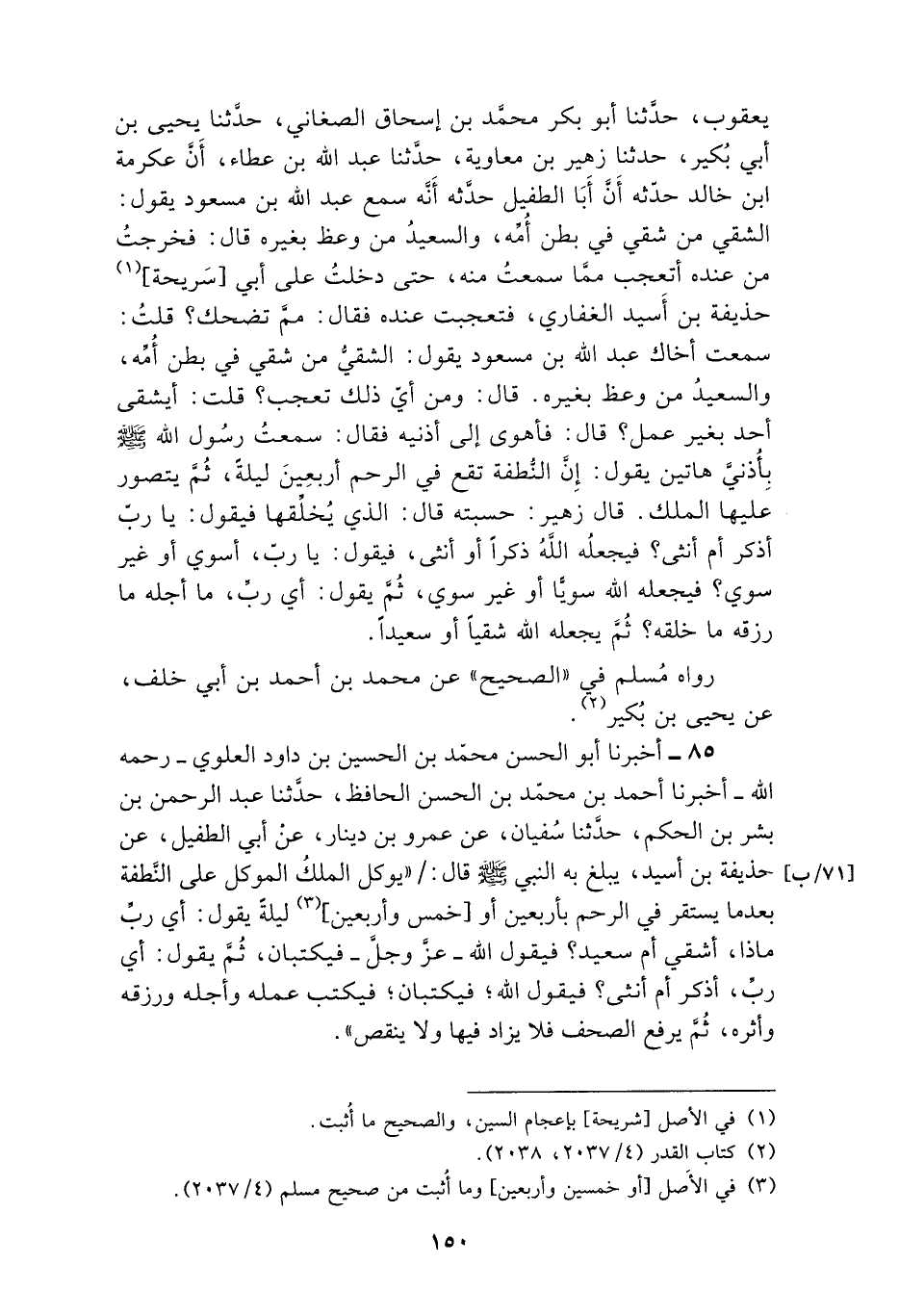 85 - أَخْبَرَنَا أَبُو الْحَسَنِ مُحَمَّدُ بْنُ الْحُسَيْنِ بْنِ دَاوُدَ الْعَلَوِيُّ رَحِمَهُ اللَّهُ، أَخْبَرَنَا أَحْمَدُ بْنُ مُحَمَّدِ بْنِ الْحَسَنِ الْحَافِظُ، حَدَّثَنَا عَبْدُ الرَّحْمَنِ بْنُ بِشْرِ بْنِ الْحَكَمِ، حَدَّثَنَا سُفْيَانُ، عَنْ عَمْرِو بْنِ دِينَارٍ، عَنْ أَبِي الطُّفَيْلِ، عَنْ حُذَيْفَةَ بْنِ أَسِيدٍ، يَبْلُغُ بِهِ النَّبِيَّ صَلَّى اللهُ عَلَيْهِ وَسَلَّمَ قَالَ: §" يُوَكَّلُ الْمَلَكُ الْمُوَكَّلُ عَلَى النُّطْفَةِ بَعْدَمَا يَسْتَقِرُّ فِي الرَّحِمِ بِأَرْبَعِينَ أَوْ خَمْسٍ وَأَرْبَعِينَ لَيْلَةً يَقُولُ: أَيْ رَبِّ مَاذَا أَشَقِيُّ أَمْ سَعِيدٌ؟ فَيَقُولُ اللَّهُ عَزَّ وَجَلَّ فَيُكْتُبَانِ ثُمَّ يَقُولُ أَيْ رَبِّ , أَذَكَرٌ أَمْ أُنْثَى؟ فَيَقُولُ اللَّهُ , فَيُكْتُبَانِ، فَيُكْتَبُ عَمَلُهُ وَأَجَلُهُ وَرِزْقُهُ وَأَثَرُهُ، ثُمَّ يَرْفَعُ الصُّحُفَ فَلَا يُزَادُ فِيهَا وَلَا يُنْقَصُ " -[151]- رَوَاهُ مُسْلِمٌ فِي الصَّحِيحِ عَنْ زُهَيْرِ بْنِ حَرْبٍ وَابْنِ نُمَيْرٍ، عَنْ سُفْيَانَ وَأَخْرَجَهُ أَيْضًا مِنْ حَدِيثِ أَبِي الزُّبَيْرِ الْمَكِّيِّ وَكُلْثُومِ بْنِ جَبْرٍ، عَنْ أَبِي الطُّفَيْلِ