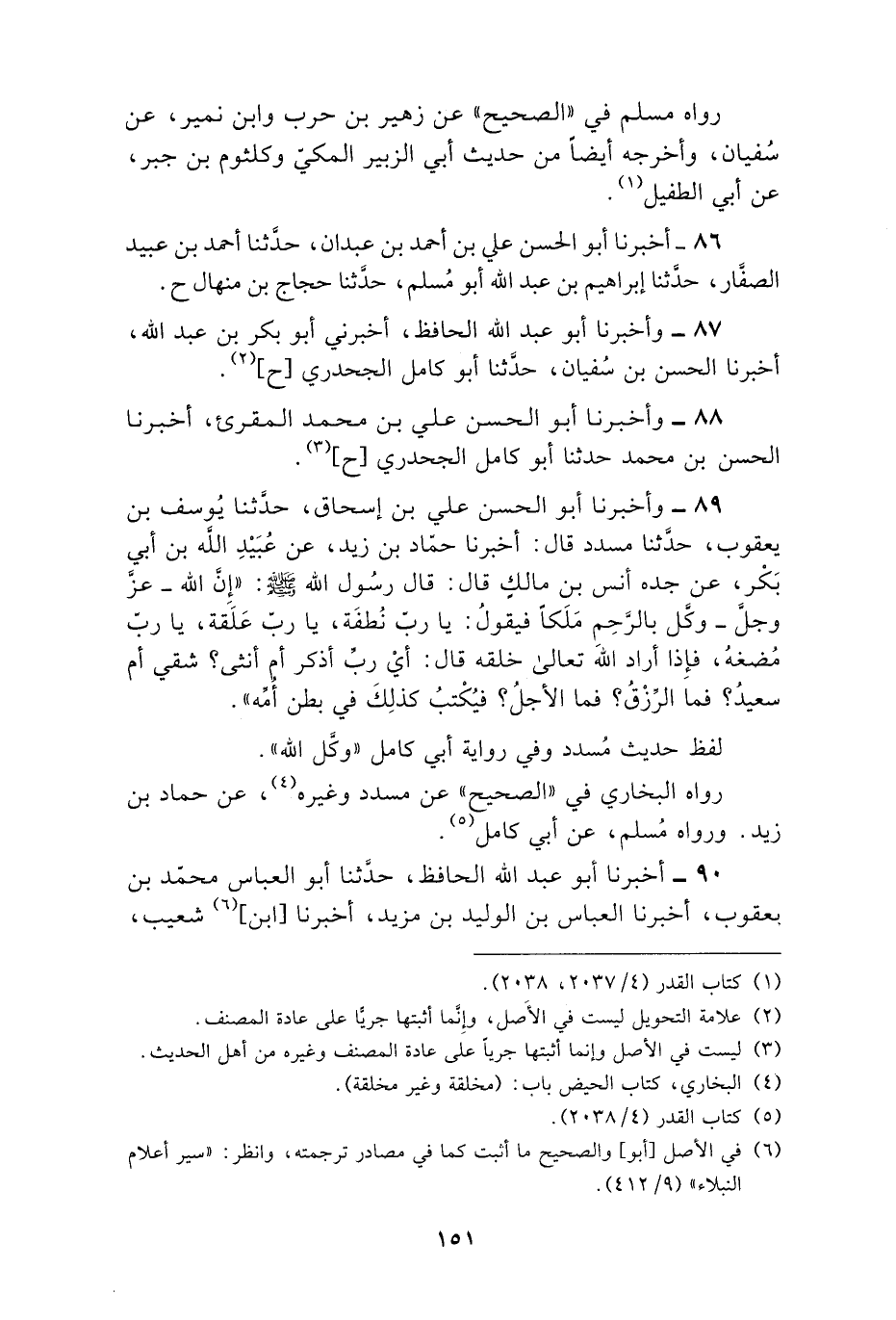 89 - وَأَخْبَرَنَا أَبُو الْحَسَنِ عَلِيُّ بْنُ إِسْحَاقَ، حَدَّثَنَا يُوسُفُ بْنُ يَعْقُوبَ، حَدَّثَنَا مُسَدَّدٌ، قَالَ: أَخْبَرَنَا حَمَّادُ بْنُ زَيْدٍ، عَنْ عُبَيْدِ اللَّهِ بْنِ أَبِي بَكْرٍ، عَنْ جَدِّهِ أَنَسِ بْنِ مَالِكٍ قَالَ: قَالَ رَسُولُ اللَّهِ صَلَّى اللهُ عَلَيْهِ وَسَلَّمَ: " إِنَّ اللَّهَ عَزَّ وَجَلَّ §وَكَّلَ بِالرَّحِمِ مَلَكًا فَيَقُولُ: يَا رَبِّ نُطْفَةً، يَا رَبِّ عَلَقَةً، يَا رَبِّ مُضْغَةً، فَإِذَا أَرَادَ اللَّهُ تَعَالَى خَلْقَهُ قَالَ: أَيْ رَبِّ أَذَكَرٌ أَمْ أُنْثَى؟ شَقِيٌّ أَمْ سَعِيدٌ؟ فَمَا الرِّزْقُ؟ فَمَا الْأَجَلُ؟ فَيُكْتَبُ كَذَلِكَ فِي بَطْنِ أُمِّهِ «لَفْظُ حَدِيثِ مُسَدَّدٍ وَفِي رِوَايَةِ أَبِي كَامِلٍ» وَكَّلَ اللَّهُ " رَوَاهُ الْبُخَارِيُّ فِي الصَّحِيحِ عَنْ مُسَدَّدٍ وَغَيْرِهِ، عَنْ حَمَّادِ بْنِ زَيْدٍ. وَرَوَاهُ مُسْلِمٌ عَنْ أَبِي كَامِلٍ