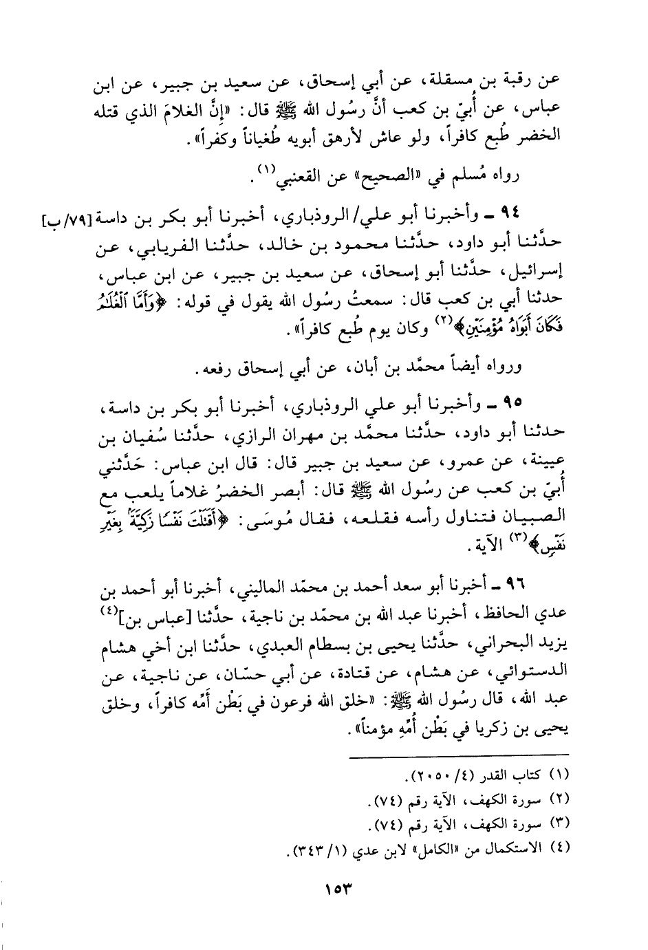 94 - وَأَخْبَرَنَا أَبُو عَلِيٍّ الرُّوذْبَارِيُّ، أَخْبَرَنَا أَبُو بَكْرِ بْنُ دَاسَةَ، حَدَّثَنَا أَبُو دَاوُدَ، حَدَّثَنَا مَحْمُودُ بْنُ خَالِدٍ، حَدَّثَنَا الْفِرْيَابِيُّ، عَنْ إِسْرَائِيلَ، حَدَّثَنَا أَبُو إِسْحَاقَ، عَنْ سَعِيدِ بْنِ جُبَيْرٍ، عَنِ ابْنِ عَبَّاسٍ، حَدَّثَنَا أُبَيُّ بْنُ كَعْبٍ، قَالَ: سَمِعْتُ رَسُولَ اللَّهِ يَقُولُ فِي قَوْلِهِ: {§وَأَمَّا الْغُلَامُ فَكَانَ أَبَوَاهُ مُؤْمِنَيْنِ} [الكهف: 80] «وَكَانَ يَوْمَ طُبِعَ كَافِرًا» وَرَوَاهُ أَيْضًا مُحَمَّدُ بْنُ أَبَانَ، عَنِ ابْنِ أَبِي إِسْحَاقَ رَفَعَهُ