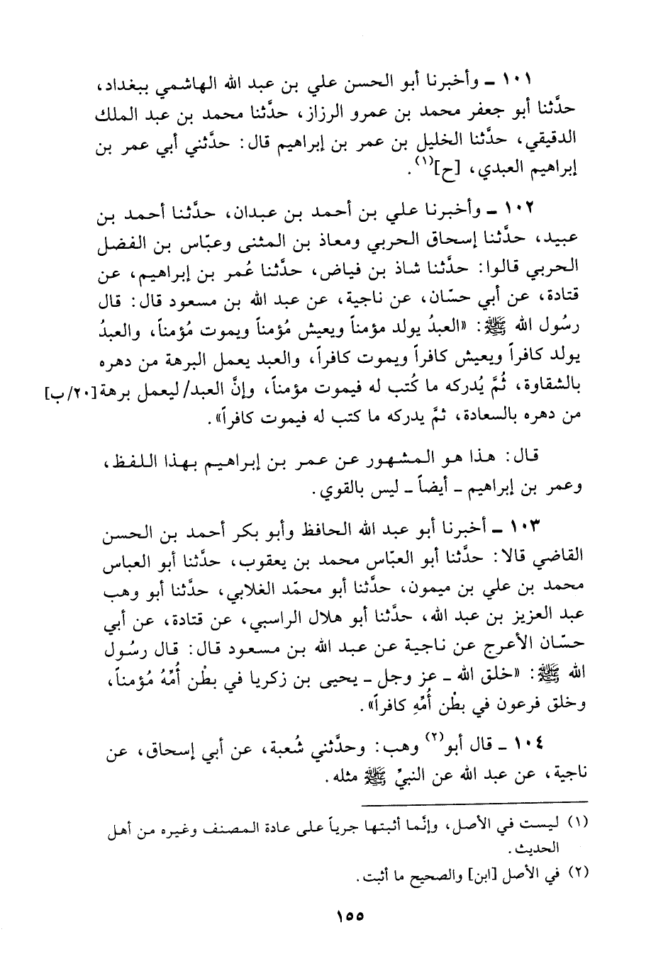 102 - وَأَخْبَرَنَا عَلِيُّ بْنُ أَحْمَدَ بْنِ عَبْدَانَ، حَدَّثَنَا أَحْمَدُ بْنُ عُبَيْدٍ، حَدَّثَنَا إِسْحَاقُ الْحَرْبِيُّ، وَمُعَاذُ بْنُ الْمُثَنَّى، وَعَبَّاسُ بْنُ الْفَضْلِ الْحَرْبِيُّ، قَالُوا: حَدَّثَنَا شَاذُّ بْنُ فَيَّاضٍ، حَدَّثَنَا عُمَرُ بْنُ إِبْرَاهِيمَ، عَنْ قَتَادَةَ، عَنْ أَبِي حَسَّانَ، عَنْ نَاجِيَةَ، عَنْ عَبْدِ اللَّهِ بْنِ مَسْعُودٍ، قَالَ: قَالَ رَسُولُ اللَّهِ صَلَّى اللهُ عَلَيْهِ وَسَلَّمَ: «§الْعَبْدُ يُولَدُ مُؤْمِنًا وَيَعِيشُ مُؤْمِنًا وَيَمُوتُ مُؤْمِنًا، وَالْعَبْدُ يُولَدُ كَافِرًا وَيَعِيشُ كَافِرًا وَيَمُوتُ كَافِرًا، وَالْعَبْدُ يَعْمَلُ الْبُرْهَةَ مِنْ دَهْرِهِ بِالشَّقَاوَةِ، ثُمَّ يُدْرِكُهُ مَا كُتِبَ لَهُ فَيَمُوتُ مُؤْمِنًا، وَإِنَّ الْعَبْدَ لَيَعْمَلُ بُرْهَةً مِنْ دَهْرِهِ بِالسَّعَادَةِ، ثُمَّ يُدْرِكُهُ مَا كُتِبَ لَهُ فَيَمُوتُ كَافِرًا» قَالَ: هَذَا هُوَ الْمَشْهُورُ عَنْ عُمَرَ بْنِ إِبْرَاهِيمَ بِهَذَا اللَّفْظِ، وَعُمَرُ بْنُ إِبْرَاهِيمَ أَيْضًا لَيْسَ بِالْقَوِيِّ