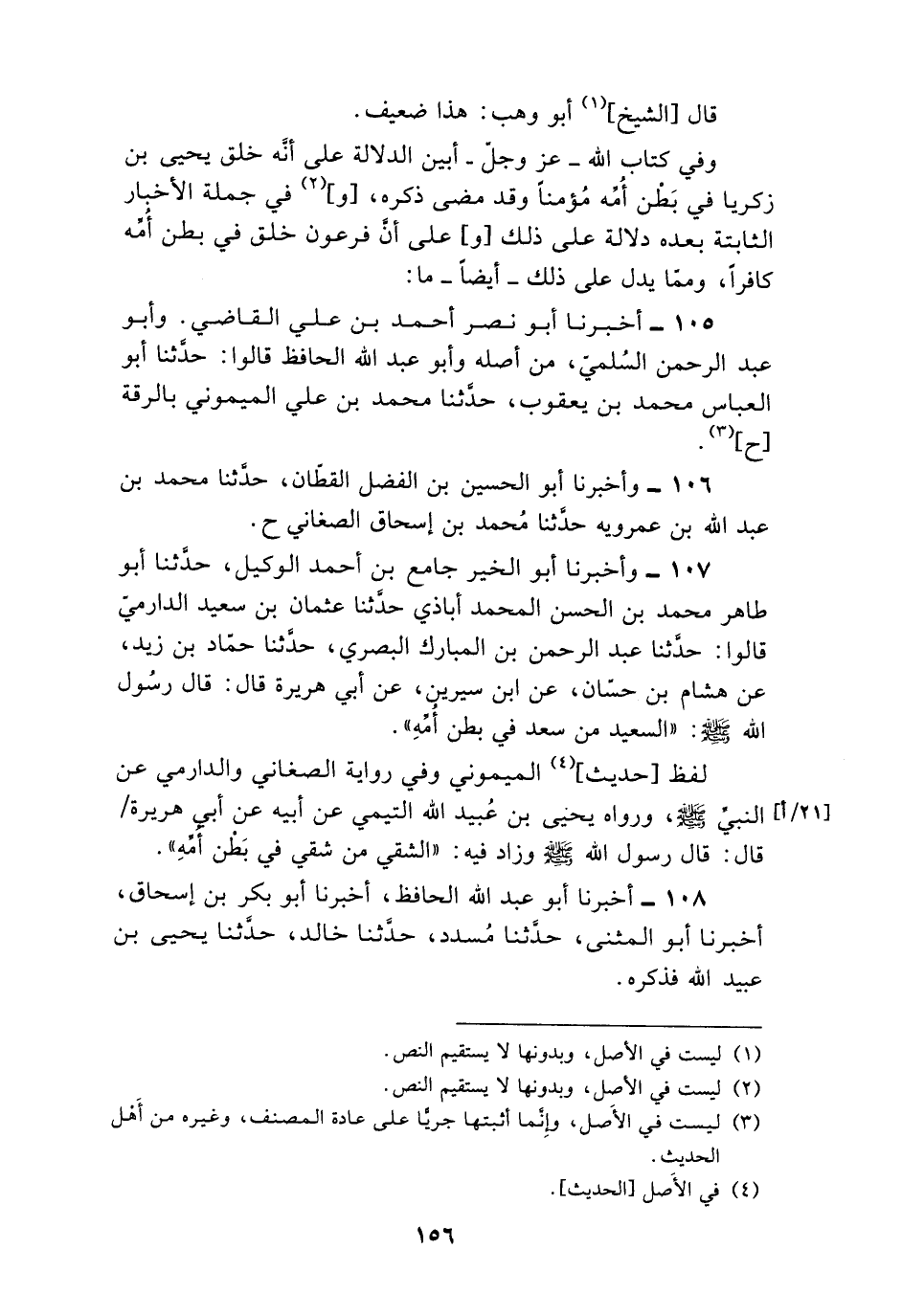 107 - وَأَخْبَرَنَا أَبُو الْخَيْرِ جَامِعُ بْنُ أَحْمَدَ الْوَكِيلُ، حَدَّثَنَا أَبُو طَاهِرٍ مُحَمَّدُ بْنُ الْحَسَنِ الْمُحَمَّدْأَبَاذِيُّ، حَدَّثَنَا عُثْمَانُ بْنُ سَعِيدٍ الدَّارِمِيُّ، قَالُوا: حَدَّثَنَا عَبْدُ الرَّحْمَنِ بْنُ الْمُبَارَكِ الْبَصْرِيُّ، حَدَّثَنَا حَمَّادُ بْنُ زَيْدٍ، عَنْ هِشَامِ بْنِ حَسَّانَ، عَنِ ابْنِ سِيرِينَ، عَنْ أَبِي هُرَيْرَةَ، قَالَ: قَالَ رَسُولُ اللَّهِ صَلَّى اللهُ عَلَيْهِ وَسَلَّمَ: §«السَّعِيدُ مَنْ سَعِدَ فِي بَطْنِ أُمِّهِ» لَفْظُ حَدِيثِ الْمَيْمُونِيِّ وَفِي رِوَايَةِ الصَّغَانِيِّ وَالدَّارِمِيِّ عَنِ النَّبِيِّ صَلَّى اللهُ عَلَيْهِ وَسَلَّمَ وَرَوَاهُ يَحْيَى بْنُ عُبَيْدِ اللَّهِ التَّيْمِيُّ عَنْ أَبِيهِ، عَنْ أَبِي هُرَيْرَةَ قَالَ: قَالَ رَسُولُ اللَّهِ صَلَّى اللهُ عَلَيْهِ وَسَلَّمَ وَزَادَ فِيهِ: «الشَّقِيُّ مَنْ شَقِيَ فِي بَطْنِ أُمِّهِ»