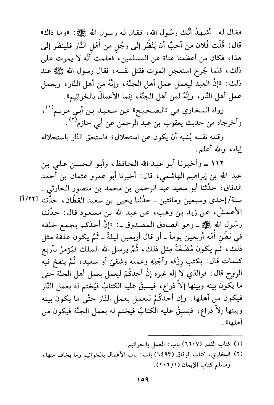 112 - وَأَخْبَرَنَا أَبُو عَبْدِ اللَّهِ الْحَافِظُ، وَأَبُو الْحَسَنِ عَلِيُّ بْنُ عَبْدِ اللَّهِ بْنِ إِبْرَاهِيمَ الْهَاشِمِيُّ قَالَ: أَخْبَرَنَا أَبُو عَمْرٍو عُثْمَانُ بْنُ أَحْمَدَ الدَّقَّاقُ، حَدَّثَنَا أَبُو سَعِيدٍ عَبْدُ الرَّحْمَنِ بْنُ مُحَمَّدِ بْنِ مَنْصُورٍ الْحَارِثِيُّ، سَنَةَ إِحْدَى وَسَبْعِينَ وَمِائَتَيْنِ حَدَّثَنَا يَحْيَى بْنُ سَعِيدٍ الْقَطَّانُ، حَدَّثَنَا الْأَعْمَشُ، عَنْ زَيْدِ بْنِ وَهْبٍ، عَنْ عَبْدِ اللَّهِ بْنِ مَسْعُودٍ قَالَ: حَدَّثَنَا رَسُولُ اللَّهِ صَلَّى اللهُ عَلَيْهِ وَسَلَّمَ وَهُوَ الصَّادِقُ الْمَصْدُوقُ: " إِنَّ §أَحَدَكُمْ يُجْمَعُ خَلْقُهُ فِي بَطْنِ أُمِّهِ أَرْبَعِينَ يَوْمًا أَوْ قَالَ أَرْبَعِينَ لَيْلَةً ثُمَّ يَكُونُ عَلَقَةً مِثْلَ ذَلِكَ، ثُمَّ يَكُونُ مُضْغَةً مِثْلَ ذَلِكَ، ثُمَّ يُرْسِلُ اللَّهُ الْمَلَكَ فَيُؤْمَرُ بِأَرْبَعِ كَلِمَاتٍ قَالَ: بِكَتْبِ رِزْقِهِ، وَأَجَلِهِ، وَعَمَلِهِ، وَشَقِيٍّ أَوْ سَعِيدٍ، ثُمَّ يَنْفُخُ فِيهِ الرُّوحَ قَالَ: فَوَالَّذِي لَا إِلَهَ غَيْرُهُ إِنَّ أَحَدَكُمْ لَيَعْمَلُ بِعَمَلِ أَهْلِ الْجَنَّةِ حَتَّى مَا يَكُونُ بَيْنَهُ وَبَيْنَهَا إِلَّا ذِرَاعٌ، فَيَسْبِقُ عَلَيْهِ الْكِتَابُ فَيُخْتَمُ لَهُ بِعَمَلِ النَّارِ فَيَكُونُ مِنْ أَهْلِهَا. وَإِنَّ أَحَدَكُمْ لَيَعْمَلُ بِعَمَلِ النَّارِ حَتَّى مَا يَكُونُ بَيْنَهُ وَبَيْنَهَا إِلَّا ذِرَاعٌ، فَيَسْبِقُ عَلَيْهِ الْكِتَابُ فَيُخْتَمُ لَهُ بِعَمَلِ الْجَنَّةِ فَيَكُونُ مِنْ أَهْلِهَا ".