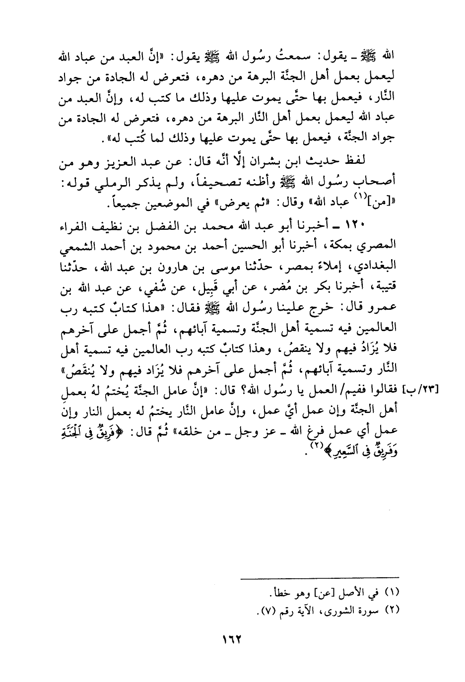 120 - أَخْبَرَنَا أَبُو عَبْدِ اللَّهِ مُحَمَّدُ بْنُ الْفَضْلِ بْنِ نَظِيفٍ الْفَرَّاءُ الْمِصْرِيُّ بِمَكَّةَ، أَخْبَرَنَا أَبُو الْحُسَيْنِ أَحْمَدُ بْنُ مَحْمُودِ بْنِ أَحْمَدَ الشَّمْعِيُّ الْبَغْدَادِيُّ إِمْلَاءً بِمِصْرَ، حَدَّثَنَا مُوسَى بْنُ هَارُونَ بْنِ عَبْدِ اللَّهِ، حَدَّثَنَا قُتَيْبَةُ، أَخْبَرَنَا بَكْرُ بْنُ مُضَرَ، عَنْ أَبِي قَبِيلٍ، عَنْ شُفَيٍّ، عَنْ عَبْدِ اللَّهِ بْنِ عَمْرٍو، قَالَ: خَرَجَ عَلَيْنَا رَسُولُ اللَّهِ صَلَّى اللهُ عَلَيْهِ وَسَلَّمَ فَقَالَ: §«هَذَا كِتَابٌ كَتَبَهُ رَبُّ الْعَالَمِينَ فِيهِ تَسْمِيَةُ أَهْلِ الْجَنَّةِ وَتَسْمِيَةُ آبَائِهِمْ، ثُمَّ أُجْمِلَ عَلَى آخِرِهِمْ فَلَا يُزَادُ فِيهِمْ وَلَا يَنْقُصُ، وَهَذَا كِتَابٌ كَتَبَهُ رَبُّ الْعَالَمِينَ فِيهِ تَسْمِيَةُ أَهْلِ النَّارِ وَتَسْمِيَةُ آبَائِهِمْ، ثُمَّ أُجْمِلَ عَلَى آخِرِهِمْ فَلَا يُزَادُ فِيهِمْ وَلَا يَنْقُصُ» فَقَالُوا فَفِيمَ الْعَمَلُ يَا رَسُولَ اللَّهِ؟ قَالَ: «إِنَّ عَامِلَ الْجَنَّةِ يُخْتَمُ لَهُ بِعَمَلِ أَهْلِ الْجَنَّةِ وَإِنَّ عَمِلَ أَيَّ عَمَلٍ، وَإِنَّ عَامِلَ النَّارِ يُخْتَمُ لَهُ بِعَمَلِ النَّارِ وَإِنْ عَمِلَ أَيَّ عَمَلٍ فَرَغَ اللَّهُ عَزَّ وَجَلَّ مِنْ خَلْقِهِ» ثُمَّ قَالَ: {فَرِيقٌ فِي الْجَنَّةِ وَفَرِيقٌ فِي السَّعِيرِ} [الشورى: 7]