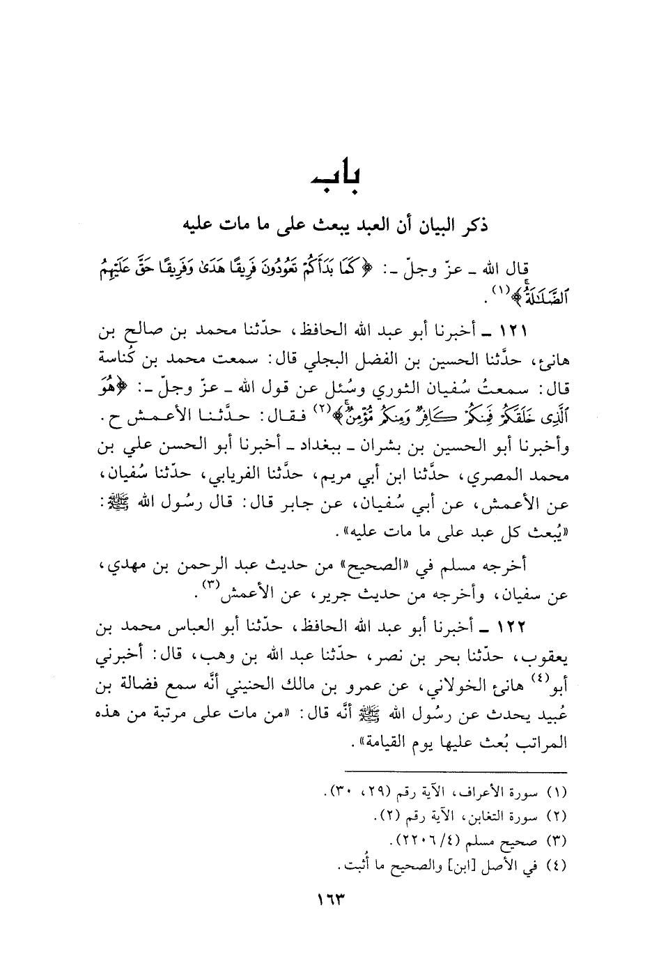 121 - أَخْبَرَنَا أَبُو عَبْدِ اللَّهِ الْحَافِظُ، حَدَّثَنَا مُحَمَّدُ بْنُ صَالِحِ بْنِ هَانِئٍ، حَدَّثَنَا الْحُسَيْنُ بْنُ الْفَضْلِ الْبَجَلِيُّ، قَالَ: سَمِعْتُ مُحَمَّدَ بْنَ كُنَاسَةَ، قَالَ: سَمِعْتُ سُفْيَانَ الثَّوْرِيَّ، وَسُئِلَ عَنْ قَوْلِ اللَّهِ عَزَّ وَجَلَّ: {هُوَ الَّذِي خَلَقَكُمْ فَمِنْكُمْ كَافِرٌ وَمِنْكُمْ مُؤْمِنٌ} [التغابن: 2] ، فَقَالَ: حَدَّثَنَا الْأَعْمَشُ ح وَأَخْبَرَنَا أَبُو الْحُسَيْنِ بْنُ بِشْرَانَ بِبَغْدَادَ، أَخْبَرَنَا أَبُو الْحَسَنِ عَلِيُّ بْنُ مُحَمَّدٍ الْمِصْرِيُّ، حَدَّثَنَا ابْنُ أَبِي مَرْيَمَ، حَدَّثَنَا الْفِرْيَابِيُّ، حَدَّثَنَا سُفْيَانُ، عَنِ الْأَعْمَشِ، عَنْ أَبِي سُفْيَانَ، عَنْ جَابِرٍ قَالَ: قَالَ رَسُولُ اللَّهِ صَلَّى اللهُ عَلَيْهِ وَسَلَّمَ: §«يُبْعَثُ كُلُّ عَبْدٍ عَلَى مَا مَاتَ عَلَيْهِ» أَخْرَجَهُ مُسْلِمٌ فِي الصَّحِيحِ مِنْ حَدِيثِ عَبْدِ الرَّحْمَنِ بْنِ مَهْدِيٍّ، عَنْ سُفْيَانَ، وَأَخْرَجَهُ مِنْ حَدِيثِ جَرِيرٍ، عَنِ الْأَعْمَشِ