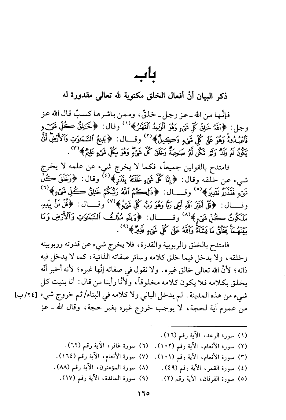 §بَابُ ذِكْرِ الْبَيَانِ أَنَّ أَفْعَالَ الْخَلْقِ مَكْتُوبَةٌ لِلَّهِ تَعَالَى مَقْدُورَةٌ لَهُ فَإِنَّهَا مِنَ اللَّهِ عَزَّ وَجَلَّ خَلْقٌ، وَمِمَّنْ بَاشَرَهَا كَسْبٌ قَالَ اللَّهُ عَزَّ وَجَلَّ: {اللَّهُ خَالِقُ كُلَّ شَيْءٍ وَهُوَ الْوَاحِدُ الْقَهَّارُ} [الرعد: 16] وَقَالَ: {خَالِقُ كُلَّ شَيْءٍ فَاعْبُدُوهُ وَهُوَ عَلَى كُلِّ شَيْءٍ وَكِيلٌ} [الأنعام: 102] وَقَالَ: {بَدِيعُ السَّمَوَاتِ وَالْأَرْضِ أَنَّى يَكُونُ لَهُ وَلَدٌ وَلَمْ تَكُنْ لَهُ صَاحِبَةٌ وَخَلَقَ كُلَّ شَيْءٍ وَهُوَ بِكُلِّ شَيْءٍ عَلِيمٌ} . فَامْتُدِحَ بِالْقَوْلَيْنِ جَمِيعًا فَكَمَا لَا يَخْرُجُ شَيْءٌ عَنْ عِلْمِهِ لَا يَخْرُجُ شَيْءٌ عَنْ خَلْقِهِ وَقَالَ: {إِنَّا كُلَّ شَيْءٍ خَلَقْنَاهُ بِقَدَرٍ} [القمر: 49] وَقَالَ: {وَخَلَقَ كُلَّ شَيْءٍ فَقَدَّرَهُ تَقْدِيرًا} [الفرقان: 2] وَقَالَ: {ذَلِكُمُ اللَّهُ رَبُّكُمْ خَالِقُ كُلِّ شَيْءٍ} [غافر: 62] وَقَالَ: {قُلْ أَغَيْرَ اللَّهِ أَبْغِي رَبًّا وَهُوَ رَبُّ كُلِّ شَيْءٍ} [الأنعام: 164] وَقَالَ: {قُلْ مَنْ بِيَدِهِ مَلَكُوتُ كُلِّ شَيْءٍ} [المؤمنون: 88] وَقَالَ: {وَلِلَّهِ مُلْكُ السَّمَوَاتِ وَالْأَرْضِ وَمَا بَيْنَهُمَا يَخْلُقُ مَا يَشَاءُ وَاللَّهُ عَلَى كُلِّ شَيْءٍ قَدِيرٌ} . فَامْتُدِحَ بِالْخَلْقِ وَالرُّبُوبِيَّةِ وَالْقُدْرَةِ، فَلَا يَخْرُجُ شَيْءٌ عَنْ قُدْرَتِهِ وَرُبُوبِيَّتِهِ وَخَلْقِهِ، وَلَا يَدْخُلُ فِيمَا خَلَقَ كَلَامُهُ وَسَائِرُ صِفَاتِهِ الذَّاتِيَّةِ، كَمَا لَا يَدْخُلُ فِيهِ ذَاتُهُ، لِأَنَّ اللَّهَ تَعَالَى خَالِقُ غَيْرِهِ. وَلَا نَقُولُ فِي صِفَاتِهِ إِنَّهَا غَيْرُهُ، لِأَنَّهُ أَخْبَرَ أَنَّهُ يَخْلُقُ بِكَلَامِهِ فَلَا يَكُونُ كَلَامُهُ مَخْلُوقًا، وَلَأَنَا رَأَيْنَا مَنْ قَالَ: أَنَا بَنَيْتُ كُلَّ شَيْءٍ مِنْ هَذِهِ الْمَدِينَةِ. لَمْ يَدْخُلِ الْبَانِي وَلَا كَلَامُهُ فِي الْبِنَاءِ ثُمَّ خُرُوجُ شَيْءٍ مِنْ عُمُومِ آيَةٍ لِحُجَّةٍ، وَلَا يُوجِبُ خُرُوجَ غَيْرِهِ بِغَيْرِ حُجَّةٍ، وَقَالَ اللَّهُ عَزَّ