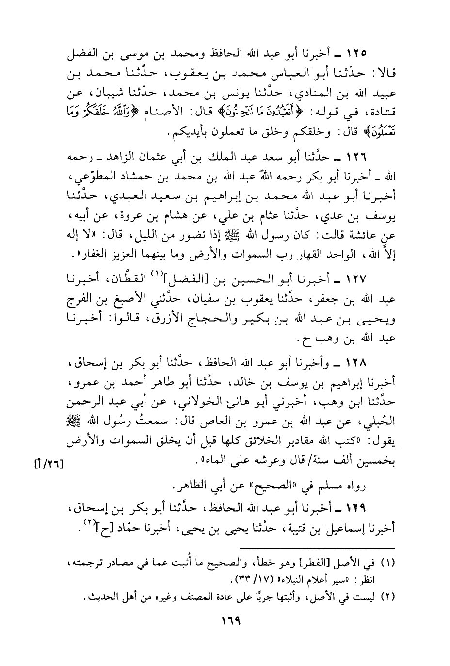 128 - وَأَخْبَرَنَا أَبُو عَبْدِ اللَّهِ الْحَافِظُ، حَدَّثَنَا أَبُو بَكْرِ بْنُ إِسْحَاقَ، أَخْبَرَنَا إِبْرَاهِيمُ بْنُ يوسُفَ بْنِ خَالِدٍ، حَدَّثَنَا أَبُو طَاهِرٍ أَحْمَدُ بْنُ عَمْرٍو، حَدَّثَنَا ابْنُ وَهْبٍ، أَخْبَرَنِي أَبُو هَانِئٍ الْخَوْلَانِيُّ، عَنْ أَبِي عَبْدِ الرَّحْمَنِ الْحُبُلِيِّ، عَنْ عَبْدِ اللَّهِ بْنِ عَمْرِو بْنِ الْعَاصِ، قَالَ: سَمِعْتُ رَسُولَ اللَّهِ صَلَّى اللهُ عَلَيْهِ وَسَلَّمَ يَقُولُ: §«كَتَبَ اللَّهُ مَقَادِيرَ الْخَلَائِقِ كُلِّهَا قَبْلَ أَنْ يَخْلُقَ السَّمَوَاتِ وَالْأَرْضَ بِخَمْسِينَ أَلْفَ سَنَةٍ قَالَ وَعَرْشُهُ عَلَى الْمَاءِ» رَوَاهُ مُسْلِمٌ فِي الصَّحِيحِ عَنْ أَبِي الطَّاهِرِ