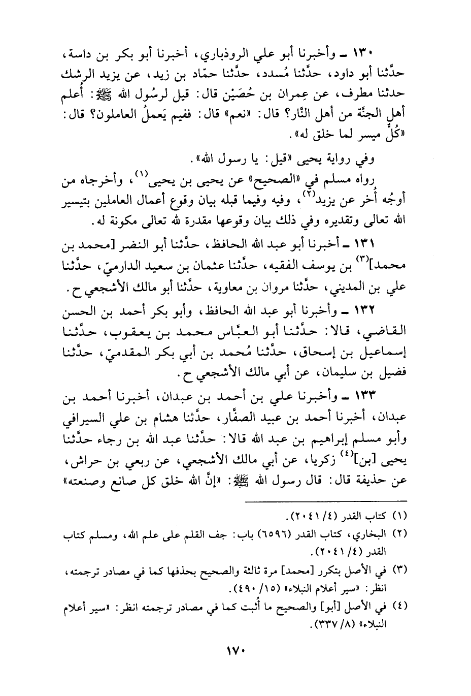 130 - وَأَخْبَرَنَا أَبُو عَلِيٍّ الرُّوذْبَارِيُّ، أَخْبَرَنَا أَبُو بَكْرِ بْنُ دَاسَةَ، حَدَّثَنَا أَبُو دَاوُدَ، حَدَّثَنَا مُسَدَّدٌ، حَدَّثَنَا حَمَّادُ بْنُ زَيْدٍ، عَنْ يَزِيدَ الرِّشْكِ، حَدَّثَنَا مُطَرِّفٌ، عَنْ عِمْرَانَ بْنِ حُصَيْنٍ، قَالَ: قِيلَ لِرَسُولِ اللَّهِ صَلَّى اللهُ عَلَيْهِ وَسَلَّمَ: أَعُلِمَ أَهْلُ الْجَنَّةِ مِنْ أَهْلِ النَّارِ؟ قَالَ: «نَعَمْ» قَالَ: فَفِيمَ يَعْمَلُ الْعَامِلُونَ؟ قَالَ: §«كُلٌّ مُيَسَّرٌ لِمَا خُلِقَ لَهُ» . وَفِي رِوَايَةِ يَحْيَى قِيلَ: يَا رَسُولَ اللَّهِ رَوَاهُ مُسْلِمٌ فِي الصَّحِيحِ عَنْ يَحْيَى بْنِ يَحْيَى، وَأَخْرَجَاهُ مِنْ أَوْجُهٍ أُخَرَ عَنْ يَزِيدَ وَفِيهِ وَفِيمَا قَبْلَهُ بَيَانُ وُقُوعِ أَعْمَالُ الْعَامِلِينَ بِتَيْسِيرِ اللَّهِ تَعَالَى وَتَقْدِيرِهِ وَفِي ذَلِكَ بَيَانُ وُقُوعِهَا مُقَدَّرَةٌ لِلَّهِ تَعَالَى مُكَوَّنَةٌ لَهُ