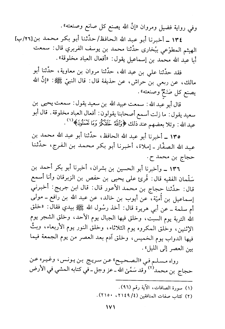 134 - أَخْبَرَنَا أَبُو عَبْدِ اللَّهِ الْحَافِظُ، حَدَّثَنَا أَبُو بَكْرٍ مُحَمَّدُ بْنُ الْهَيْثَمِ الْمُطَّوِّعِيُّ بِبُخَارَى، حَدَّثَنَا مُحَمَّدُ بْنُ يُوسُفَ الْفَرَبْرِيُّ، قَالَ: سَمِعْتُ أَبَا عَبْدِ اللَّهِ مُحَمَّدَ بْنَ إِسْمَاعِيلَ يَقُولُ: §«أَفْعَالُ الْعِبَادِ مَخْلُوقَةٌ» .
