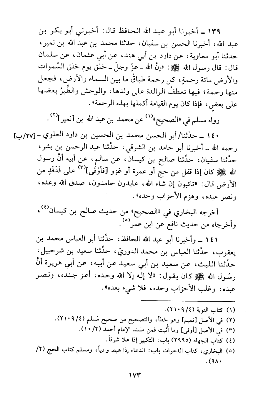 139 - أَخْبَرَنَا أَبُو عَبْدِ اللَّهِ الْحَافِظُ، قَالَ: أَخْبَرَنِي أَبُو بَكْرِ بْنُ عَبْدِ اللَّهِ، أَخْبَرَنَا الْحَسَنُ بْنُ سُفْيَانَ، حَدَّثَنَا مُحَمَّدُ بْنُ عَبْدِ اللَّهِ بْنِ نُمَيْرٍ، حَدَّثَنَا أَبُو مُعَاوِيَةَ، عَنْ دَاوُدَ بْنِ أَبِي هِنْدٍ، عَنْ أَبِي عُثْمَانَ، عَنْ سَلْمَانَ، قَالَ: قَالَ رَسُولُ اللَّهِ صَلَّى اللهُ عَلَيْهِ وَسَلَّمَ: «إِنَّ اللَّهَ عَزَّ وَجَلَّ §خَلَقَ يَوْمَ خَلَقَ السَّمَوَاتِ وَالْأَرْضَ مِائَةَ رَحْمَةٍ كُلَّ رَحْمَةٍ طِبَاقُ مَا بَيْنَ السَّمَاءِ وَالْأَرْضِ، فَجَعَلَ مِنْهَا رَحْمَةً فَبِهَا تَعْطِفُ الْوَالِدَةُ عَلَى وَلَدِهَا، وَالْوَحْشُ وَالطَّيْرُ بَعْضُهَا عَلَى بَعْضٍ، فَإِذَا كَانَ يَوْمُ الْقِيَامَةِ أَكْمَلَهَا بِهَذِهِ الرَّحْمَةِ» رَوَاهُ مُسْلِمٌ فِي الصَّحِيحِ عَنْ مُحَمَّدِ بْنِ عَبْدِ اللَّهِ بْنِ نُمَيْرٍ