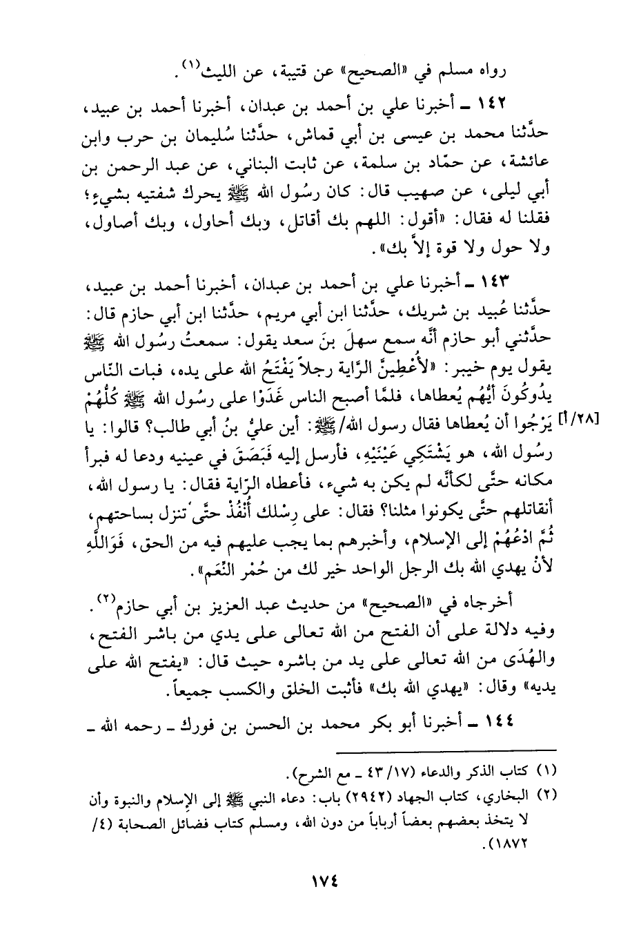 143 - أَخْبَرَنَا عَلِيُّ بْنُ أَحْمَدَ بْنِ عَبْدَانَ، أَخْبَرَنَا أَحْمَدُ بْنُ عُبَيْدٍ، حَدَّثَنَا عُبَيْدُ بْنُ شَرِيكٍ، حَدَّثَنَا ابْنُ أَبِي مَرْيَمَ، حَدَّثَنَا ابْنُ أَبِي حَازِمٍ، قَالَ: حَدَّثَنِي أَبُو حَازِمٍ، أَنَّهُ سَمِعَ سَهْلَ بْنَ سَعْدٍ، يَقُولُ: سَمِعْتُ رَسُولَ اللَّهِ صَلَّى اللهُ عَلَيْهِ وَسَلَّمَ يَقُولُ يَوْمَ خَيْبَرٍ: §«لَأُعْطِيَنَّ الرَّايَةَ رَجُلًا يَفْتَحُ اللَّهُ عَلَى يَدِهِ» فَبَاتَ النَّاسُ يَدُوكُونَ أَيُّهُمْ يُعْطَاهَا، فَلَمَّا أَصْبَحَ النَّاسُ غَدَوْا عَلَى رَسُولِ اللَّهِ صَلَّى اللهُ عَلَيْهِ وَسَلَّمَ كُلُّهُمْ يَرْجُوا أَنْ يُعْطَاهَا فَقَالَ رَسُولُ اللَّهِ صَلَّى اللهُ عَلَيْهِ وَسَلَّمَ: «أَيْنَ عَلِيُّ بْنُ أَبِي طَالِبٍ؟» قَالُوا: يَا رَسُولَ اللَّهِ هُوَ يَشْتَكِي عَيْنَيْهِ، فَأَرْسَلَ إِلَيْهِ فَبَصَقَ فِي عَيْنَيْهِ وَدَعَا لَهُ فَبَرَأَ مَكَانَهُ حَتَّى لَكَأَنَّهُ لَمْ يَكُنْ بِهِ شَيْءٌ، فَأَعْطَاهُ الرَّايَةَ فَقَالَ: يَا رَسُولَ اللَّهِ، أَنُقَاتِلُهُمْ حَتَّى يَكُونُوا مِثْلَنَا؟ فَقَالَ: «عَلَى رِسْلِكَ أُنْفُذْ حَتَّى تَنْزِلَ بِسَاحَتِهِمْ، ثُمَّ ادْعُهُمْ إِلَى الْإِسْلَامِ، وَأَخْبِرْهُمْ بِمَا يَجِبُ عَلَيْهِمْ فِيهِ مِنَ الْحَقِّ، فَوَاللَّهِ لِأَنْ يَهْدِي اللَّهُ بِكَ الرَّجُلَ الْوَاحِدَ خَيْرٌ لَكَ مِنْ حُمْرِ النَّعَمِ» أَخْرَجَاهُ فِي الصَّحِيحِ مِنْ حَدِيثِ عَبْدِ الْعَزِيزِ بْنِ أَبِي حَازِمٍ وَفِيهِ دَلَالَةٌ عَلَى أَنَّ الْفَتْحَ مِنَ اللَّهِ تَعَالَى عَلَى يَدَيْ مَنْ بَاشَرَ الْفَتْحَ، وَالْهُدَى مِنَ اللَّهِ تَعَالَى عَلَى يَدِ مَنْ بَاشَرَهُ حَيْثُ قَالَ: «يَفْتَحُ اللَّهُ عَلَى يَدَيْهِ» وَقَالَ: «يَهْدِي اللَّهُ بِكَ» فَأَثْبَتَ الْخَلْقَ وَالْكَسْبَ جَمِيعًا