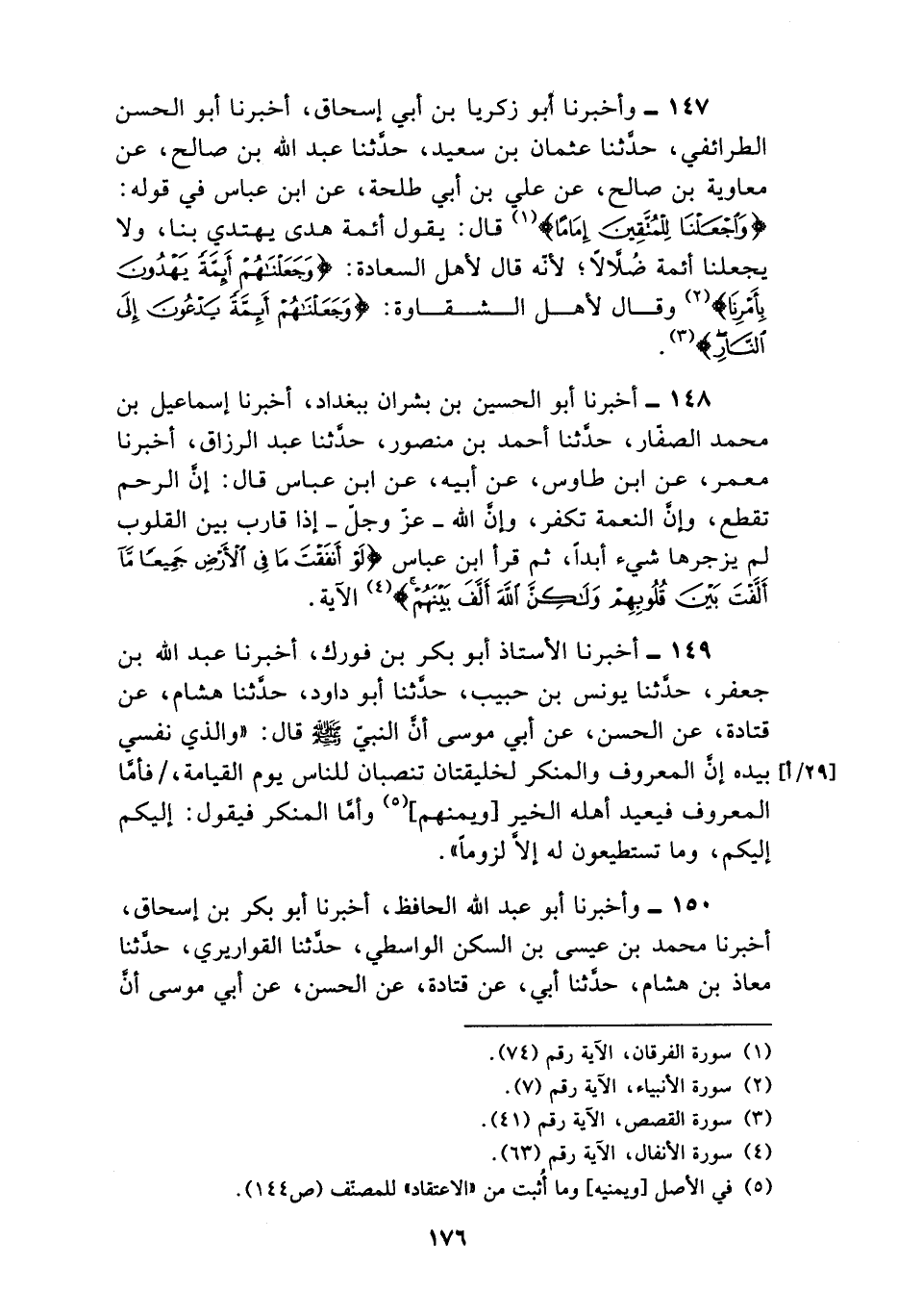 147 - وَأَخْبَرَنَا أَبُو زَكَرِيَّا بْنُ أَبِي إِسْحَاقَ، أَخْبَرَنَا أَبُو الْحَسَنِ الطَّرَائِفِيُّ، حَدَّثَنَا عُثْمَانُ بْنُ سَعِيدٍ، حَدَّثَنَا عَبْدُ اللَّهِ بْنُ صَالِحٍ، عَنْ مُعَاوِيَةَ بْنِ صَالِحٍ، عَنْ عَلِيِّ بْنِ أَبِي طَلْحَةَ، عَنِ ابْنِ عَبَّاسٍ، فِي قَوْلِهِ: {§وَاجْعَلْنَا لِلْمُتَّقِينَ إِمَامًا} [الفرقان: 74] قَالَ: " يَقُولُ أَئِمَّةُ هُدًى يَهْتَدِي بِنَا، وَلَا يَجْعَلْنَا أَئِمَّةً ضُلَّالًا، لِأَنَّهُ قَالَ لِأَهْلِ السَّعَادَةِ {وَجَعَلْنَاهُمْ أَئِمَّةً يَهْدُونَ بِأَمْرِنَا} [الأنبياء: 73] وَقَالَ لِأَهْلِ الشَّقَاوَةِ: {وَجَعَلْنَاهُمْ أَئِمَّةً يَدْعُونَ إِلَى النَّارِ} [القصص: 41] "