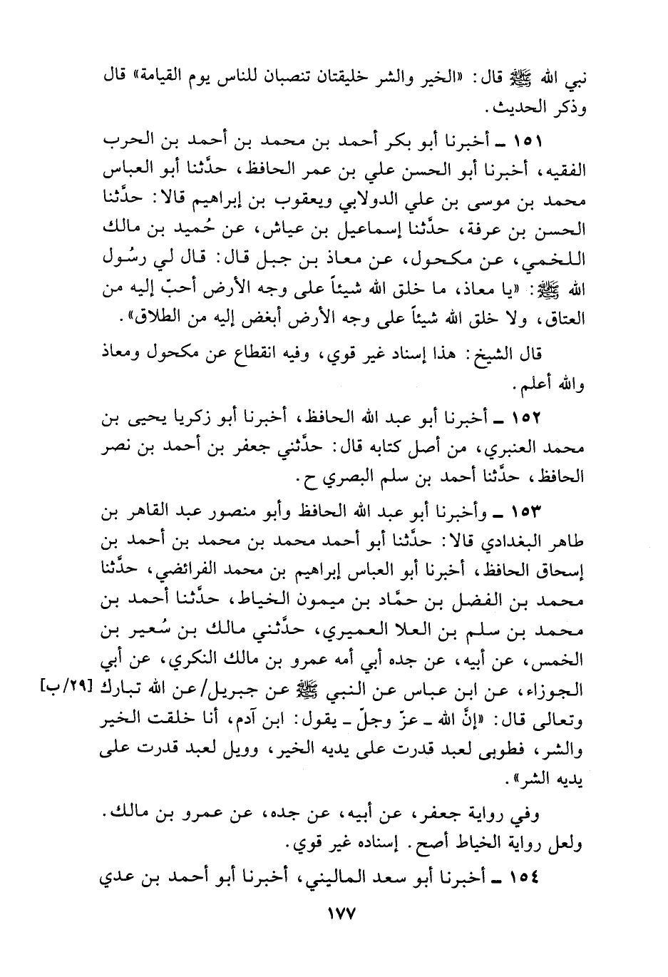 153 - وَأَخْبَرَنَا أَبُو عَبْدِ اللَّهِ الْحَافِظُ، وَأَبُو مَنْصُورٍ عَبْدُ الْقَاهِرِ بْنُ طَاهِرٍ الْبَغْدَادِيُّ قَالَا: حَدَّثَنَا أَبُو أَحْمَدَ مُحَمَّدُ بْنُ مُحَمَّدِ بْنِ أَحْمَدَ بْنِ إِسْحَاقَ الْحَافِظُ، أَخْبَرَنَا أَبُو الْعَبَّاسِ إِبْرَاهِيمُ بْنُ مُحَمَّدٍ الْفَرَائِضِيُّ، حَدَّثَنَا مُحَمَّدُ بْنُ الْفَضْلِ بْنِ حَمَّادِ بْنِ مَيْمُونٍ الْخَيَّاطُ، حَدَّثَنَا أَحْمَدُ بْنُ مُحَمَّدِ بْنِ سَلْمِ بْنِ الْعُلَا الْعُمَيْرِيُّ، حَدَّثَنِي مَالِكُ بْنُ سُعَيْرِ بْنِ الْخِمْسِ، عَنْ أَبِيهِ، عَنْ جَدِّهِ أَبِي أُمِّهِ عَمْرِو بْنِ مَالِكٍ النُّكَرِيِّ، عَنْ أَبِي الْجَوْزَاءِ، عَنِ ابْنِ عَبَّاسٍ، عَنِ النَّبِيِّ صَلَّى اللهُ عَلَيْهِ وَسَلَّمَ عَنْ جِبْرِيلَ عَنِ اللَّهِ تَبَارَكَ وَتَعَالَى قَالَ: إِنَّ اللَّهَ عَزَّ وَجَلَّ يَقُولُ: «ابْنَ آدَمَ §أَنَا خَلَقْتُ الْخَيْرَ وَالشَّرَّ، فَطُوبَى لِعَبْدٍ قَدَّرْتُ عَلَى يَدَيْهِ الْخَيْرَ، وَوَيْلٌ لِعَبْدٍ قَدَّرْتُ عَلَى يَدَيْهِ الشَّرَّ» وَفِي رِوَايَةِ جَعْفَرٍ، عَنْ أَبِيهِ، عَنْ جَدِّهِ، عَنْ عَمْرِو بْنِ مَالِكٍ. وَلَعَلَّ رِوَايَةَ الْخَيَّاطِ أَصَحُّ إِسْنَادُهُ غَيْرُ قَوِيٍّ